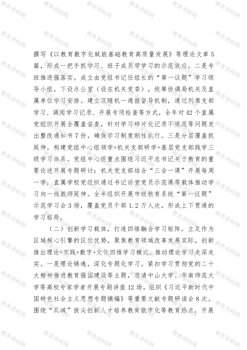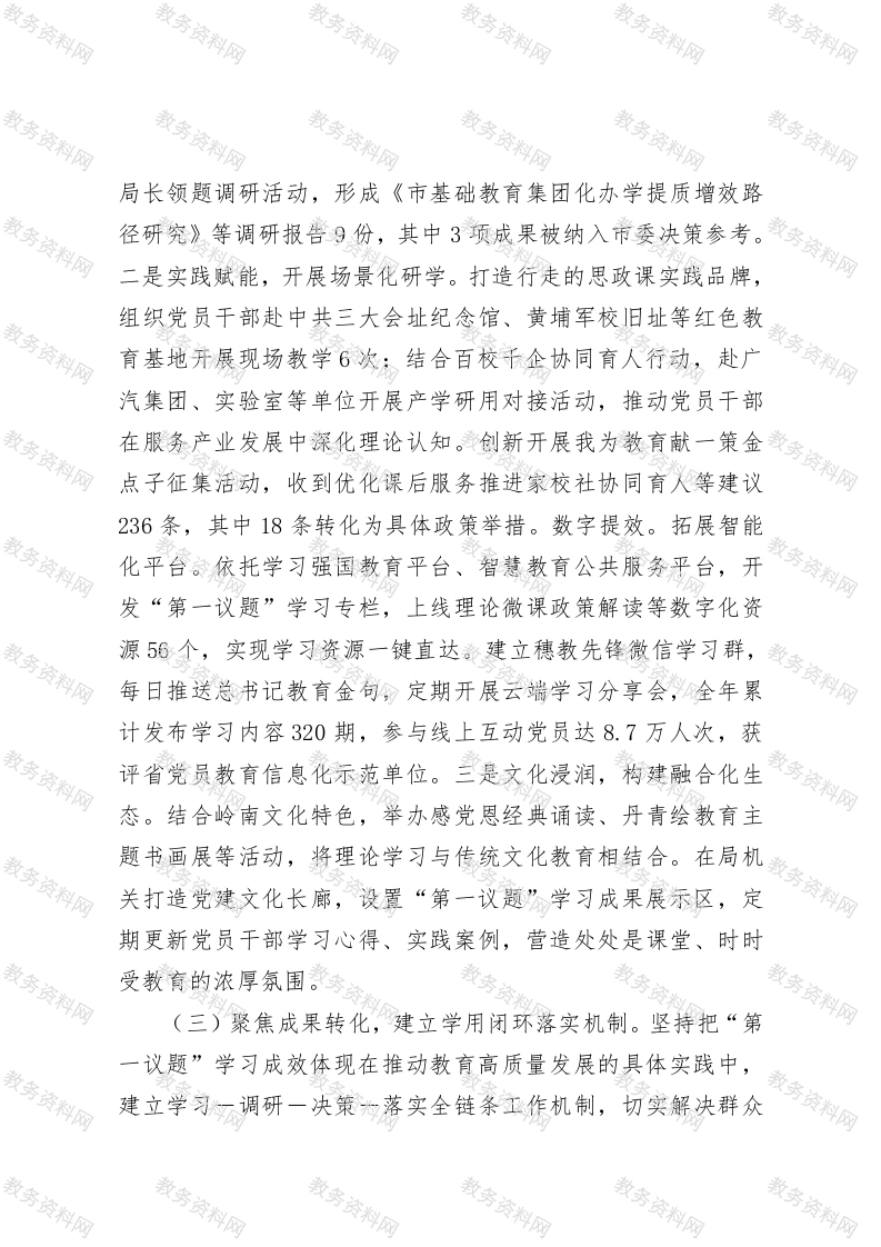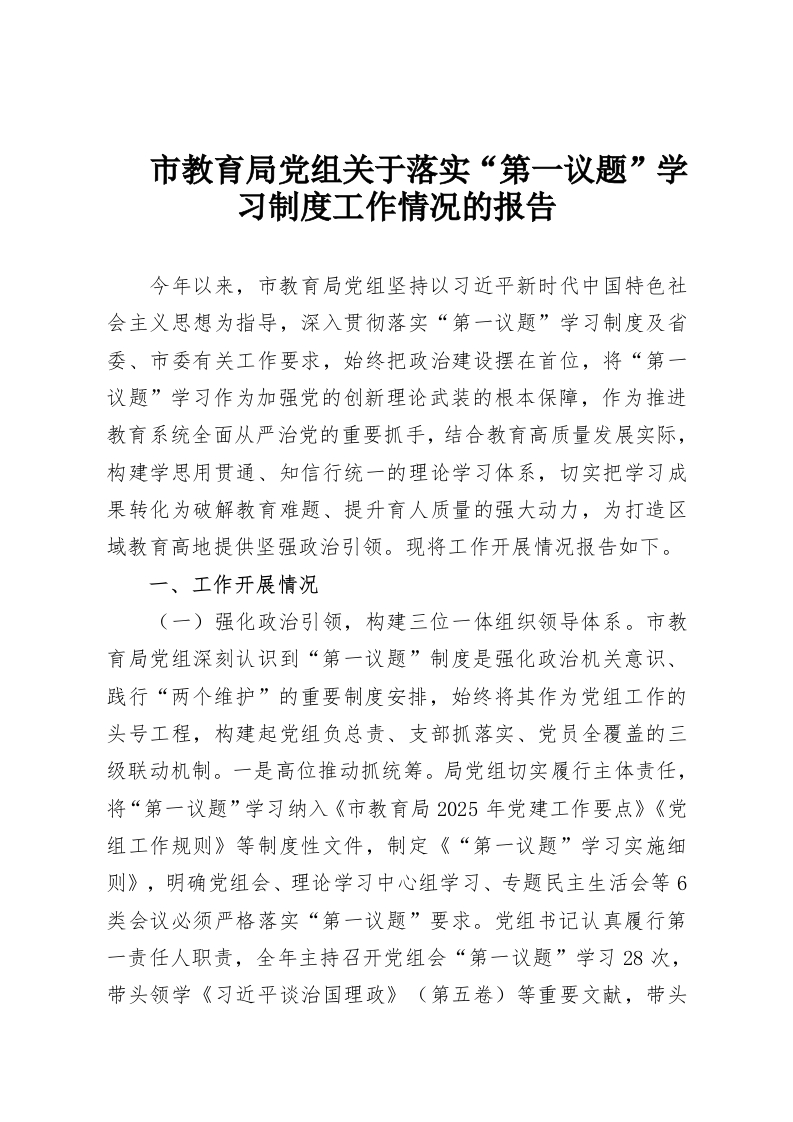 市教育局党组关于落实“第一议题”学习制度工作情况的报告今年以来,市教育局党组坚持以习近平新时代中国特色社会主义思想为指导,深入贯彻落实“第一议题”学习制度及省委、市委有关工作要求,始终把政治建设摆在首位,将“第一议题”学习作为加强党的创新理论武装的根本保障,作为推进教育系统全面从严治党的重要抓手,结合教育高质量发展实际,构建学思用贯通、知信行统一的理论学习体系,切实把学习成果转化为破解教育难题、提升育人质量的强大动力,为打造区域教育高地提供坚强政治引领。现将工作开展情况报告如下。一、工作开展情况(一)强化政治引领,构建三位一体组织领导体系。市教育局党组深刻认识到“第一议题”制度是强化政治机关意识、践行“两个维护”的重要制度安排,始终将其作为党组工作的头号工程,构建起党组负总责、支部抓落实、党员全覆盖的三级联动机制。一是高位推动抓统筹。局党组切实履行主体责任,将“第一议题”学习纳入《市教育局2025年党建工作要点》《党组工作规则》等制度性文件,制定《“第一议题”学习实施细则》,明确党组会、理论学习中心组学习、专题民主生活会等6类会议必须严格落实“第一议题”要求。党组书记认真履行第一责任人职责,全年主持召开党组会“第一议题”学习28次,带头领学《习近平谈治国理政》(第五卷)等重要文献,带头