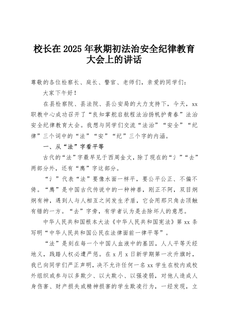 校长在2025年秋期初法治安全纪律教育大会上的讲话尊敬的各位检察长、庭长、警官、老师们,亲爱的同学们:大家下午好!在县检察院、县法院、县公安局的大力支持下,今天,Xx职教中心成功召开了“良知掌舵启航程法治扬帆护青春”法治安全纪律教育大会。我想与同学们交流“法治”“安全”“纪律”三个词中的“法”“安”“纪”三个字的内涵。一、从“法”字看平等古代的“法”字最早见于西周金文,除了现在的“氵”“去”两部分外,还有“廌”字这部分。“氵”代表“法”要像水面一样平,要公平公正、不偏不倚。“廌”是中国古代传说中的一种神兽,刚正不阿,双目炯炯有神,遇到人与人相互之间发生矛盾,它会用那只角去顶触有错的一方。“去”字旁,有学者认为是去除坏人的意思。中华人民共和国根本大法《中华人民共和国宪法》第xx条写明“中华人民共和国公民在法律面前一律平等”。“法”是刻在每一个中国人血液中的基因,人人平等天经地义,践踏人权必遭严惩。在x月x日新学期第一次升旗时,我已向同学们严正声明,决不允许任何一名Xx学生在校内或校外组织或参与以多欺少、以大欺小、以强凌弱,对他人造成人身伤害、财产损失或精神损害的学生欺凌行为,一经发现,立