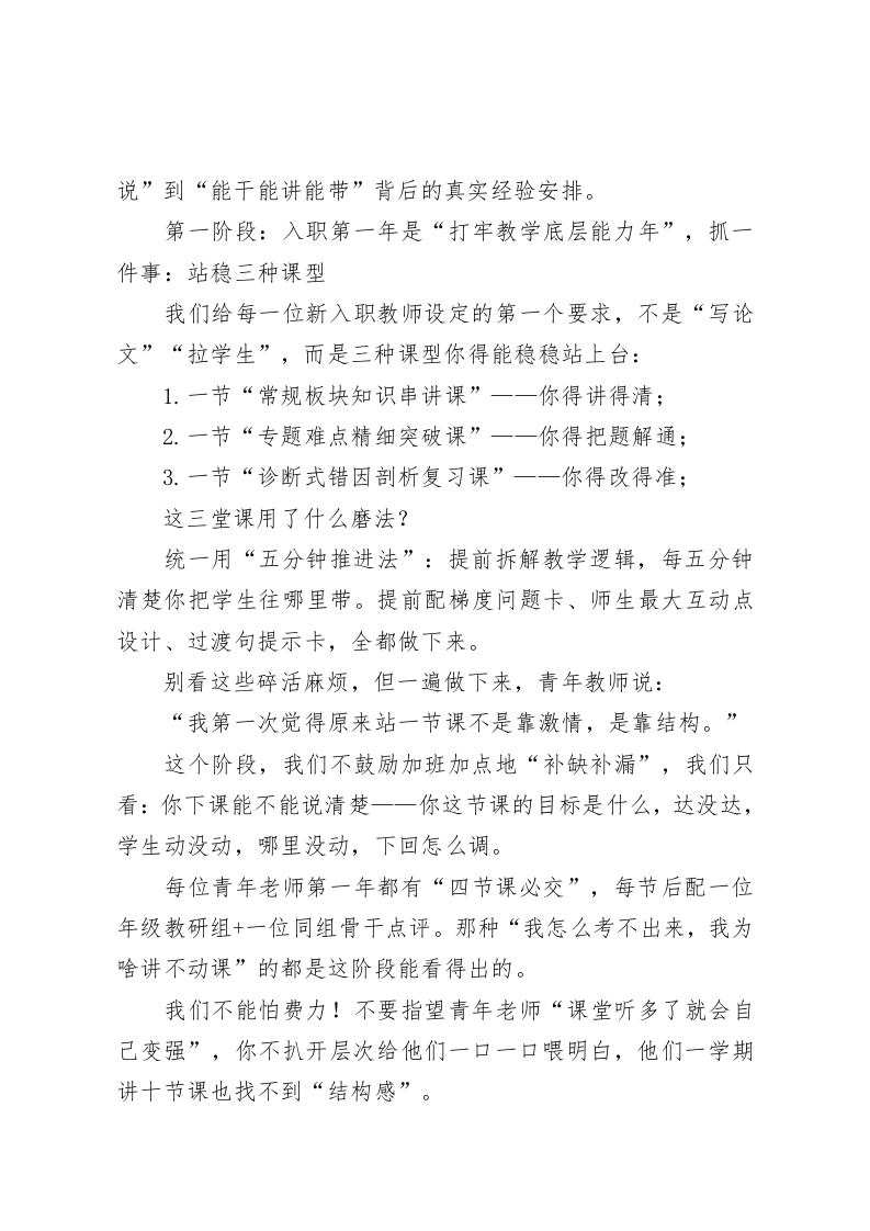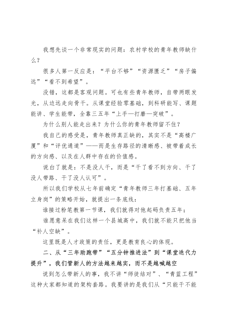 校长在学校培养青年教师经验交流会上的发言:青春不待,从“青涩”到“出彩”怎么破圈?各位教育同仁、老师朋友们:大家上午好!今天能在这样一个充满教育情怀与教育使命感的会议上,和来自各地的校长、干部、专家老师们围绕“青年教师的培养”这个话题展开分享,我感到,既荣幸,也感触很多。我来自一所县域的普通高中。是一所非常“典型”的学校一一硬件不是最先进的,生源不是最拔尖的,地处的是山区偏远,年年都在往“怎么办”里琢磨,从没在“等靠要”里躲过。但就是在这样的学校,我们看到的是一群年轻教师用力成长、一届又一届学生逐步成长的真实图景。我们提出过很多方案,走了不少弯路,其中最坚定的,就是一条:谁能带起青年教师的劲气,谁就有了学校最硬的底牌。我今天就跟大家聊聊,在我们这样的农村学校里,我们是怎么带新人,是如何积蓄“教师队伍新动能”的。这些,不是文件里的“应做事项”,也不全是职评里看的“材料成果”,都是我们一级一级把人带出来、把课堂撑起来、把骨干扎下去的过程经验。一、教师队伍不是靠“政策招录”形成的,是靠“用得住、留得住、带得起”养出来的