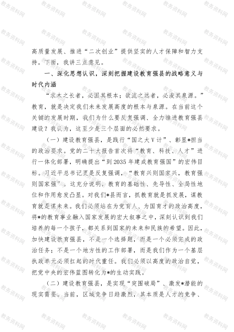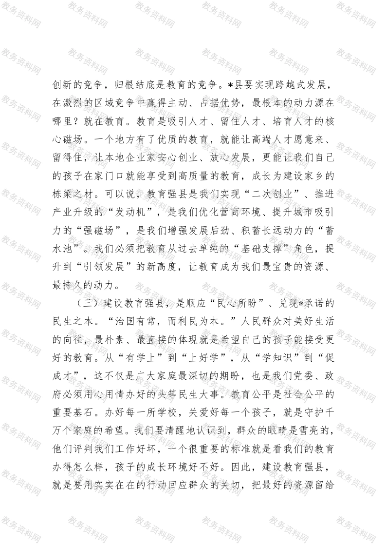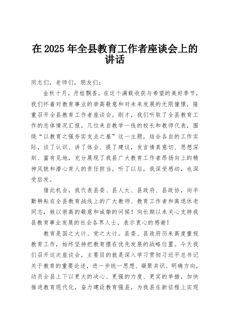 在2025年全县教育工作者座谈会上的讲话同志们,老师们,朋友们:金秋十月,丹桂飘香。在这个满载收获与希望的美好季节,我们怀着对教育事业的崇高敬意和对未来发展的无限憧憬,隆重召开全县教育工作者座谈会。刚才,我们听取了全县教育工作的总体情况汇报,几位来自教学一线的校长和教师代表,围绕“以教育之强夯实支点之基”这一主题,结合各自的工作实际,谈了认识、讲了体会、提了建议,发言情真意切、思想深刻、富有见地,充分展现了我县广大教育工作者昂扬向上的精神风貌和潜心育人的责任担当。听了以后,我深受感动,也深受启发。借此机会,我代表县委、县人大、县政府、县政协,向辛勤耕耘在全县教育战线上的广大教师、教育工作者和离退休老同志,致以崇高的敬意和诚挚的问候!向长期以来关心支持我县教育事业发展的社会各界人士,表示衷心的感谢!教育是国之大计、党之大计。县委、县政府历来高度重视教育工作,始终坚持把教育摆在优先发展的战略位置。今天我们召开这次座谈会,主要目的就是深入学习贯彻习近平总书记关于教育的重要论述,进一步统一思想、凝聚共识、明确方向,动员全县上下以更大的决心、更强的力度、更实的举措,加快推进教育现代化,奋力建设教育强县,为我县在新征程上实现