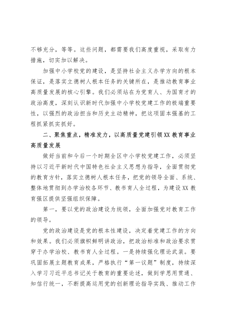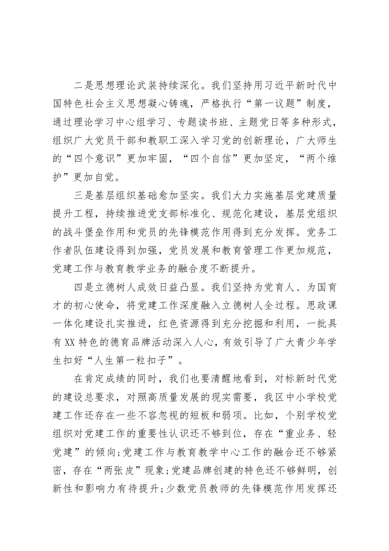 在XX区中小学校党建工作推进会议上的讲话(精品)同志们:今天,我们在这里召开全区中小学校党建工作推进会议,主要任务是深入学习贯彻习近平总书记关于党的建设的重要思想和关于教育的重要论述,全面落实全国、省、市相关会议精神,总结经验、分析形势,研究部署下一阶段我区中小学校党建工作的重点任务。刚才,几位同志作了很好的交流发言,分享了宝贵经验,听了很受启发。下面,我讲几点意见。一、肯定成绩,正视不足,切实增强抓好新时代中小学校党建工作的责任感和紧迫感近年来,区委教育工委坚决贯彻落实中央和省委、市委、区委关于加强中小学校党的建设的决策部署,全区教育系统各级党组织坚持以政治建设为统领,聚焦主责主业,狠抓工作落实,推动中小学校党建工作取得了显著成效。一是政治核心作用不断彰显。我们始终把党的政治建设摆在首位,严格落实党组织领导的校长负责制,全区中小学校党组织的领导核心和政治核心地位得到全面巩固。党组织在学校重大事项决策、监督保障、沟通协调等方面发挥了关键作用,“把方向、管大局、作决策、抓班子、带队伍、保落实”的领导职责得到有效履行,确保了党的教育方针不折不扣地在XX落地生根。