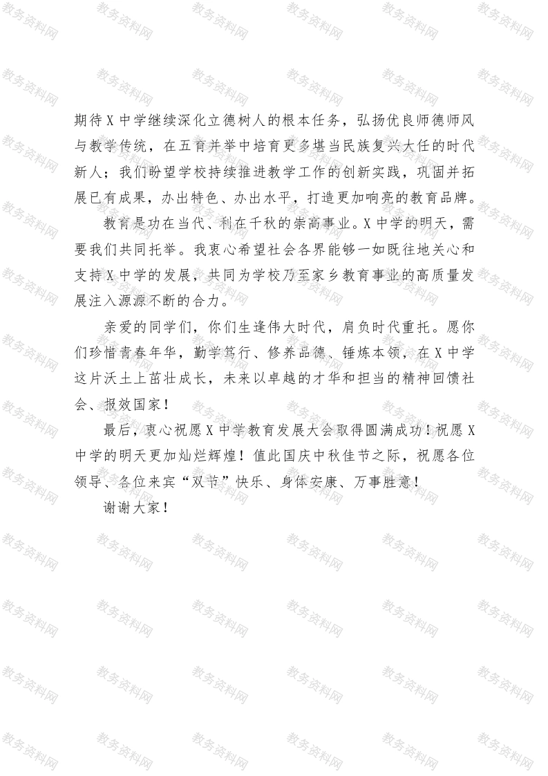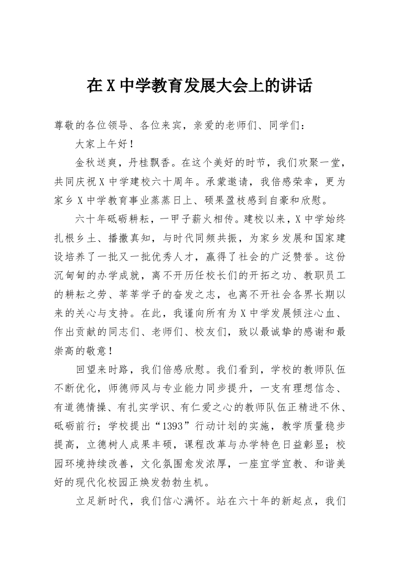 在X中学教育发展大会上的讲话尊敬的各位领导、各位来宾,亲爱的老师们、同学们:大家上午好!金秋送爽,丹桂飘香。在这个美好的时节,我们欢聚一堂,共同庆祝X中学建校六十周年。承蒙邀请,我倍感荣幸,更为家乡X中学教育事业蒸蒸日上、硕果盈枝感到自豪和欣慰。六十年砥砺耕耘,一甲子薪火相传。建校以来,X中学始终扎根乡土、播撒真知,与时代同频共振,为家乡发展和国家建设培养了一批又一批优秀人才,赢得了社会的广泛赞誉。这份沉甸甸的办学成就,离不开历任校长们的开拓之功、教职员工的耕耘之劳、莘莘学子的奋发之志,也离不开社会各界长期以来的关心与支持。在此,我谨向所有为X中学发展倾注心血、作出贡献的同志们、老师们、校友们,致以最诚挚的感谢和最崇高的敬意!回望来时路,我们倍感欣慰。我们看到,学校的教师队伍不断优化,师德师风与专业能力同步提升,一支有理想信念、有道德情操、有扎实学识、有仁爱之心的教师队伍正精进不休、砥砺前行;学校提出“1393”行动计划的实施,教学质量稳步提高,立德树人成果丰硕,课程改革与办学特色日益彰显;校园环境持续改善,文化氛围愈发浓厚,一座宜学宜教、和谐美好的现代化校园正焕发勃勃生机。立足新时代,我们信心满怀。站在六十年的新起点,我们