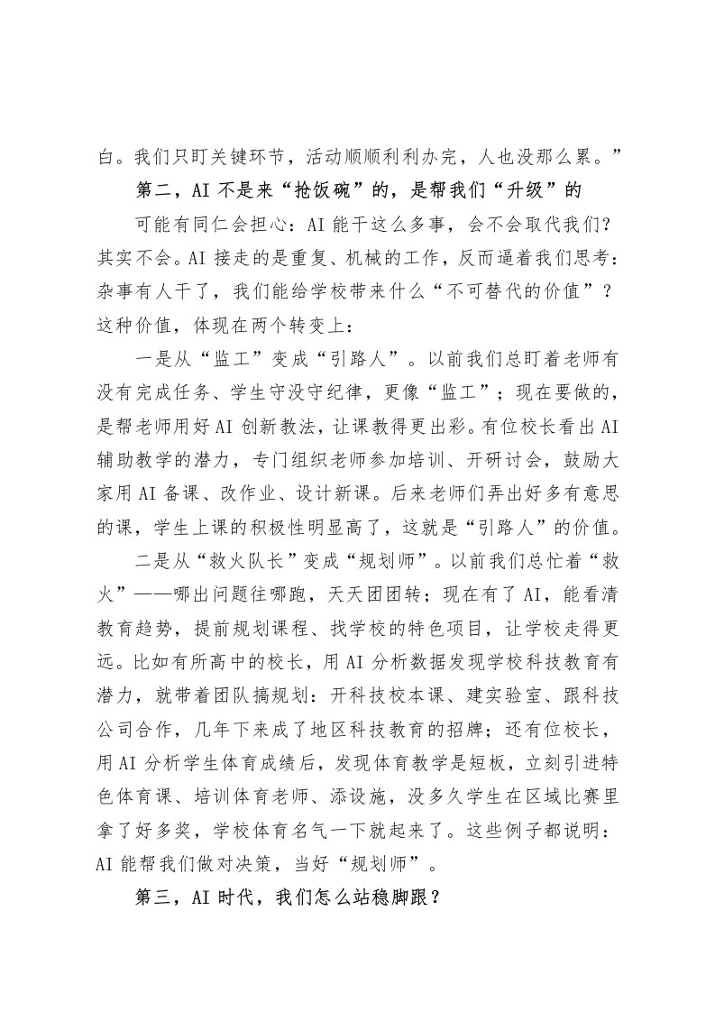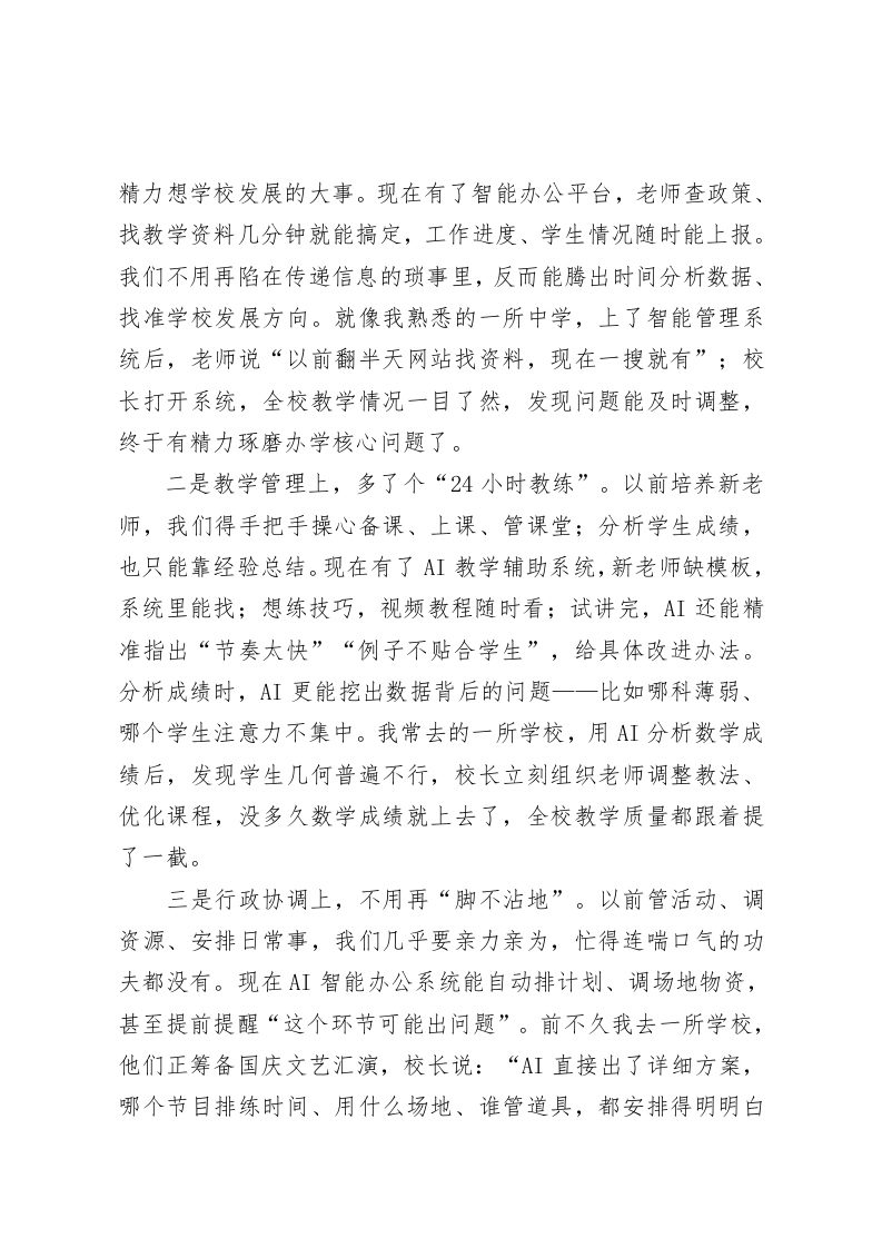在校长论坛的发言:以AI为翼,做新时代教育的领航者尊敬的各位同仁:大家好!今天能和各位教育同行齐聚一堂,探讨“人工智能与教育变革”这个话题,我特别有感触。不知道大家有没有这样的体会:近些年教育形势跑得特别快,有一股力量正悄悄重塑我们的学校管理一一这就是人工智能。国家智慧教育平台开通三周年之际,教育部召开的2025年教育数字化战略行动部署会,主题正是“人工智能与教育变革”。当时听怀进鹏部长讲话时,有人跟我说“不懂人工智能的校长,早晚会被淘汰”,我起初还觉得这话有点刺耳。可后来仔细琢磨,再加上研读了国家刚印发的《关于深入实施“人工智能+”行动的意见》一一里面明确提出要“把人工智能融入教育教学全要素、全过程,加强人才队伍建设”,我现在真切认同这句话:校长不主动学AI、用AI,真的可能被时代甩在后面。第一,人工智能早已接过我们不少“日常活儿”咱们当校长的,以前总被各种琐事缠得脱不开身,而现在,AI已经成了我们管理上的“好帮手”,主要体现在三个方面:一是信息传递上,从“传话筒”变成了“指挥塔”。过去我们像“信息中转站”,老师的汇报、学生的情况、家长的反馈要往上递,上级的政策、指示要往下传,效率低不说,还没