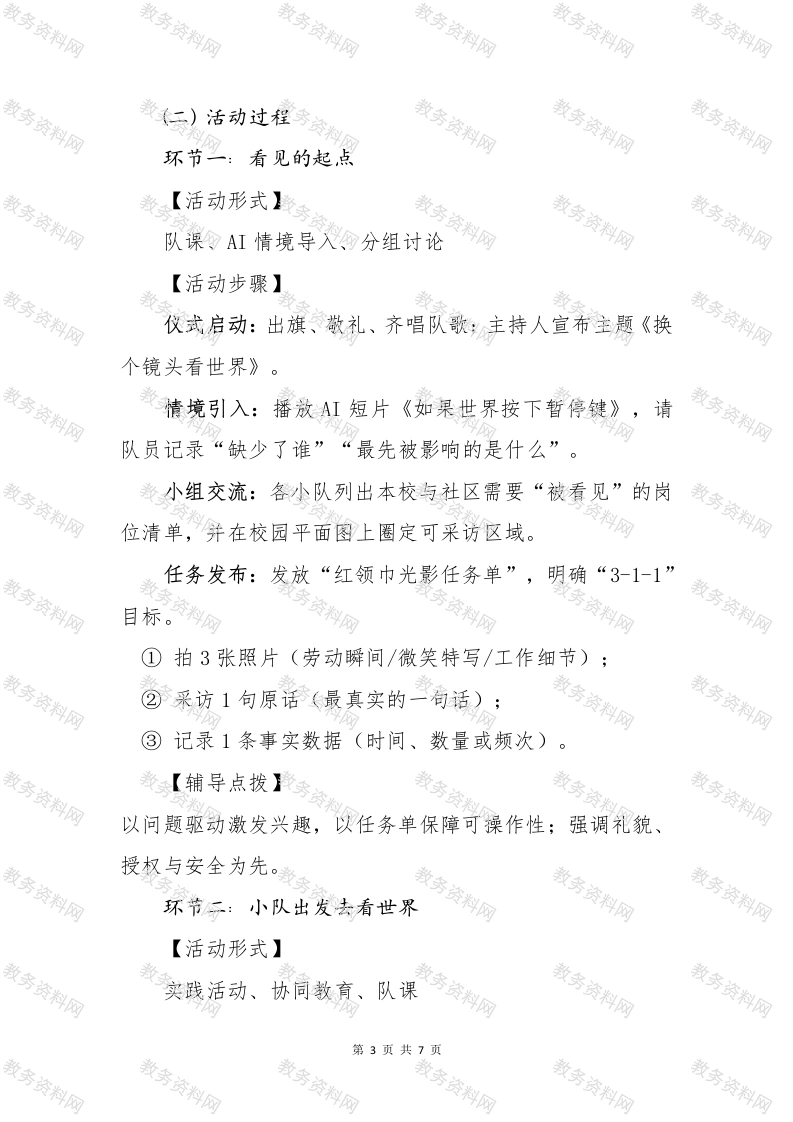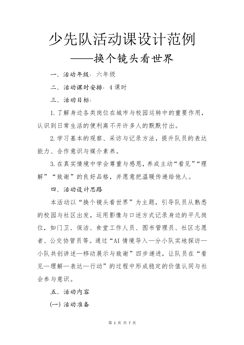 少先队活动课设计范例换个镜头看世界一、活动年级:六年级二、活动课时安排:4课时三、活动目标:1.了解身边各类岗位在城市与校园运转中的重要作用,认识到日常生活的便利离不开许多人的默默付出。2.学习基本的观察、采访与记录方法,提升队员的表达能力、合作意识与媒介素养。3.在真实情境中学会尊重与感恩,养成主动“看见”“理解”“致谢”的良好品格,并愿意把温暖传递给他人。四、活动设计思路本活动以“换个镜头看世界”为主题,引导队员从熟悉的校园与社区出发,运用影像与口述方式记录身边的平凡岗位,如门卫、保洁、食堂工作人员、图书管理员、社区志愿者、公交协管员等。通过“AI情境导入一分小队实地探访一小队共创讲述一移动展示与致谢”四步递进,让队员在“看见一理解一表达一行动”的过程中形成稳定的价值认同与社会参与意识。五、活动内容(一)活动准备第1页共7页