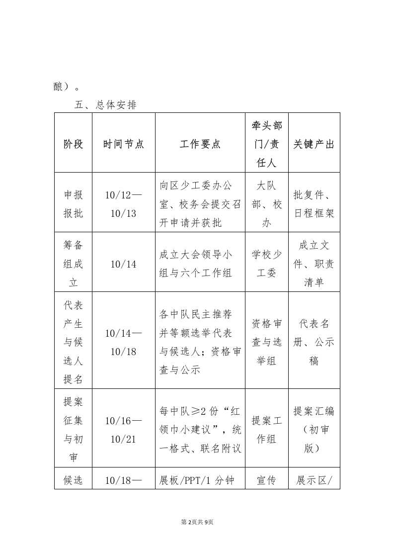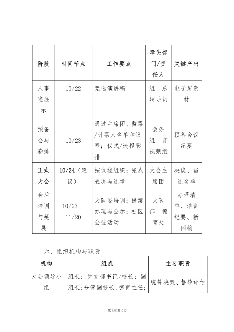 2025年学校少代会实施方案一强国复兴有我,争当新时代好少年为深入贯彻少先队有关法规制度,健全学校少先队民主治理机制,落实“学校少代会每学年召开一次”的要求,经学校少工委研究,决定于建队日期间召开中国少年先锋队第十次少先队员代表大会,简称“学校少代会”。一、指导思想以少先队员为中心,践行“勤奋学习、快乐生活、全面发展”育人目标,通过代表产生、民主选举、提案议政等程序,提升队员的组织归属、主体意识与社会责任,推动学校少先队组织建设与活动提质增效。学校少工委按职责按时组织召开学校少代会并组织执行会议决议。二、活动主题强国复兴有我,争当新时代好少年三、时间与地点主会期:2025年10月13日(周一)14:30一17:30筹备与实施周期:2025年10月14日一11月20日地点:二楼报告厅(主会场);各班教室(分会场/酝酿点)四、参加人员主会场:二一六年级每中队2名代表,学校领导,相关处室负责人,非中队辅导员代表,第十届大队委候选人。分会场:全体少先队员及各中队辅导员(同步收看/参与酝第1页共9页