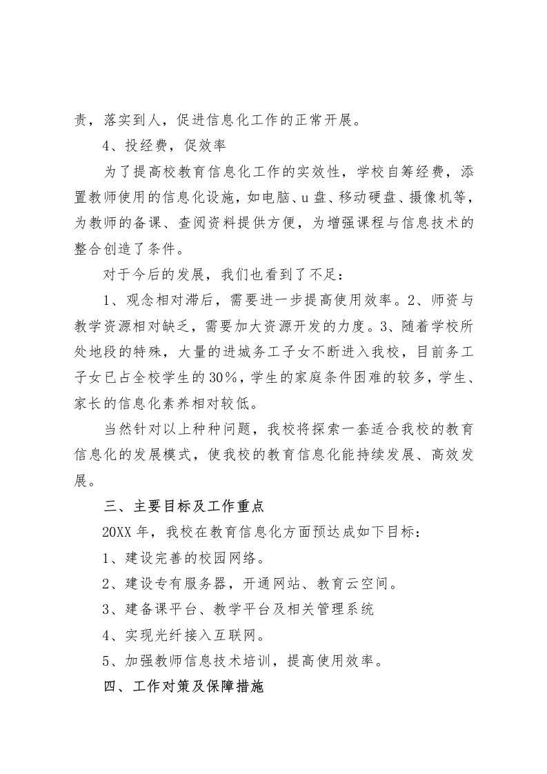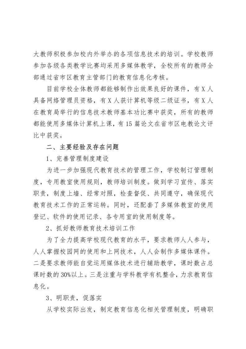 XX县教育信息化建设情况,校长汇报发言力争以创新求发展,全力打造数字化校园尊敬的各位领导、同仁:大家好!近年来,随着信息技术的迅速发展,省市区加大了对中小学教育信息化建设投入力度,特别是在xx省“校校通”工程的实施以来,我校的教育信息化建设也取得了巨大进步。一、基本情况及主要成绩我校建成的硬件设施有:全校拥有计算机xxx台,计算机教室X个,多媒体教室X个,投影仪X台,打印机X台,并且学校实现20兆光纤接入互联网,学校建有网站,为师生访问信息提供了通道。几年来,随着设备的不断投入,学校领导做好了周密的计划,有效、合理地利用资源,为教育、教学服务。学校建立了以校长为组长、覆盖所有学科的信息化工作推进小组,制定信息化工作的发展规划,并根据发展规划制定每学期的工作重点,使我校的信息化工作持续的推进。一直以来我校以现代信息技术教育为抓手,结合学校特色工作,在短短的几年时间里,学校所取得的成绩,都离不开现代信息技术教育在学校发展、教师专业成长中所起到的促进作用。学校教育信息化,落脚点还在学科教学上。在听课、评课、教学比赛活动中,都明确必须要和信息技术整合。学校鼓励广