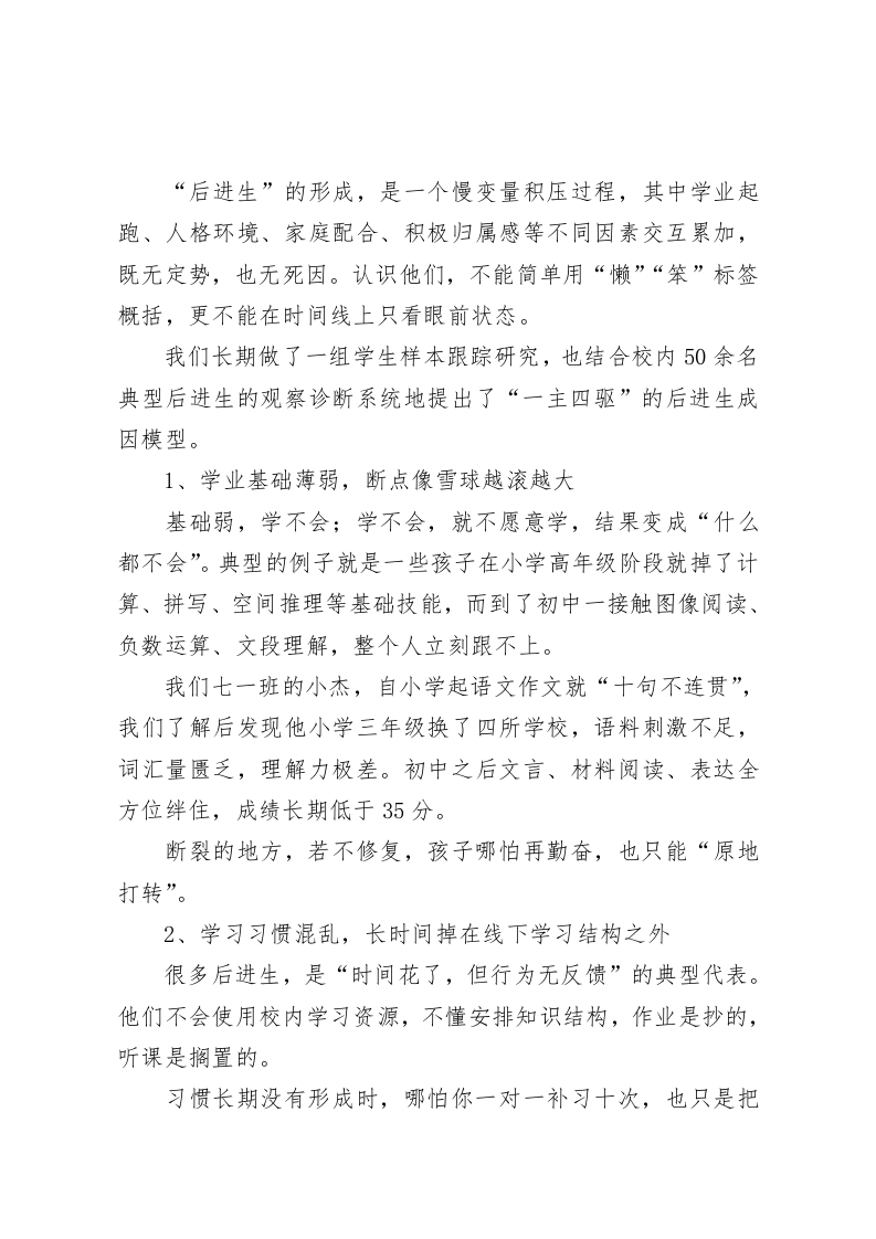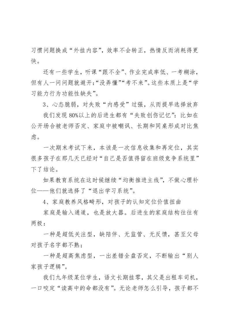 后进生也能逆袭!副校长在交流会上分享三项关键转化策略,全场教师频频点头尊敬的各位教育同行,亲爱的老师们:大家好!很荣幸今天有这样的机会,在这里向各位汇报我校在“后进生成绩突破”这条漫长而艰难的教育路径上的一些切身实践与思考。我来自一所典型的城乡接合部公办初级中学。既没有重点学科优势,也谈不上生源优质…我们的孩子,是大家熟悉的“普通生”一一其中,还有相当一部分属于“后进学生”:他们成绩总在下游、情绪隐隐不稳、学习没有成就感,一次次被数据定义,又一次次从主流讨论里被边缘化。在这里,我想非常真诚地说:在任何一所学校,后进生,从来都不是“附带产物”,而是我们教育工作的试金石和硬任务;我们对一个后进生的态度,某种角度上决定了我们办学理念的边界、教育责任的尺度,以及教师职业良知的温度。今天,我围绕这个核心话题,跟大家分享我们学校在这几年所做的一些探索,很多正在进行中,也尚未成熟,但真心希望我们的经验,能为大家的思考提供一点落点。一、问题不大不小,症结永远都不止一条:从多元维度辨识“掉链子”学生的真实困境