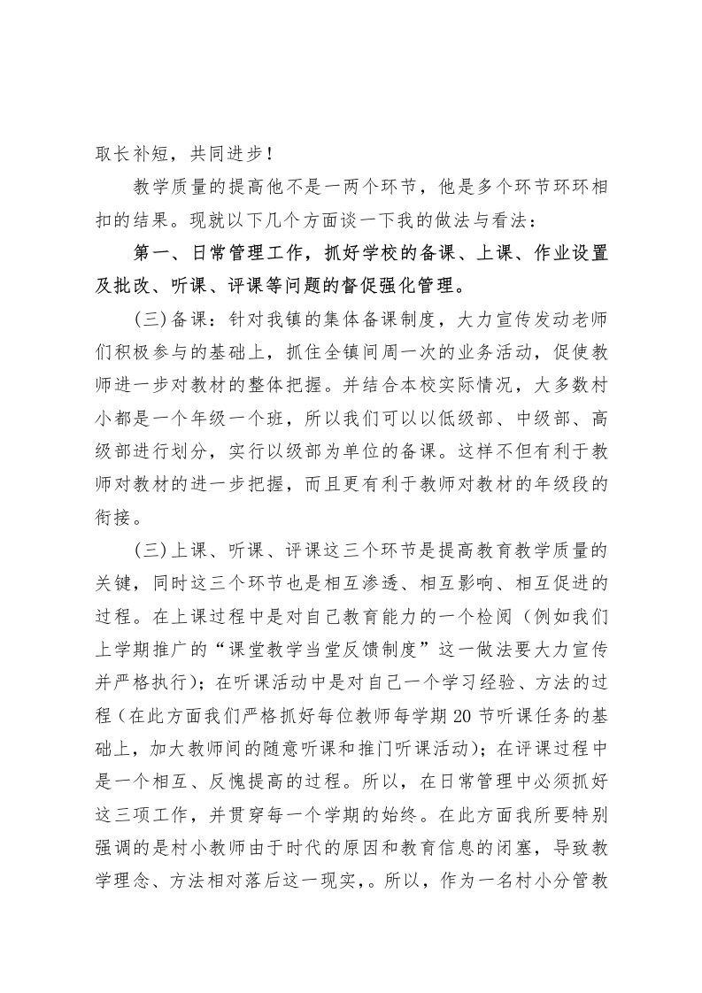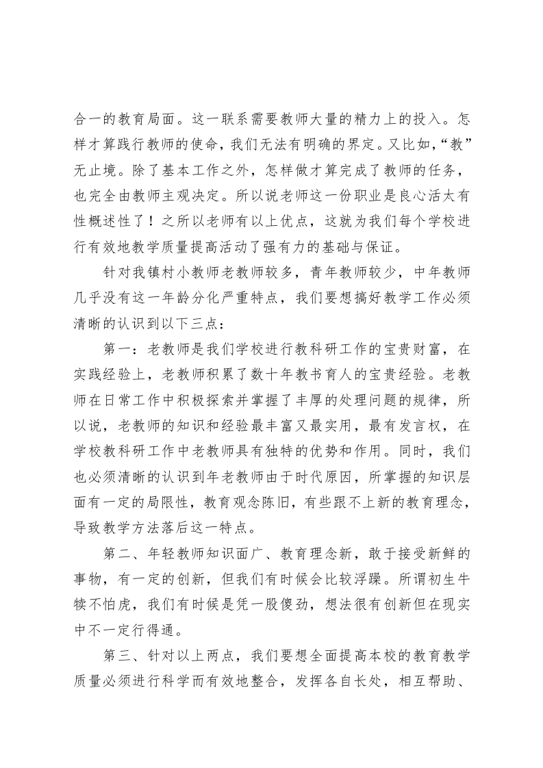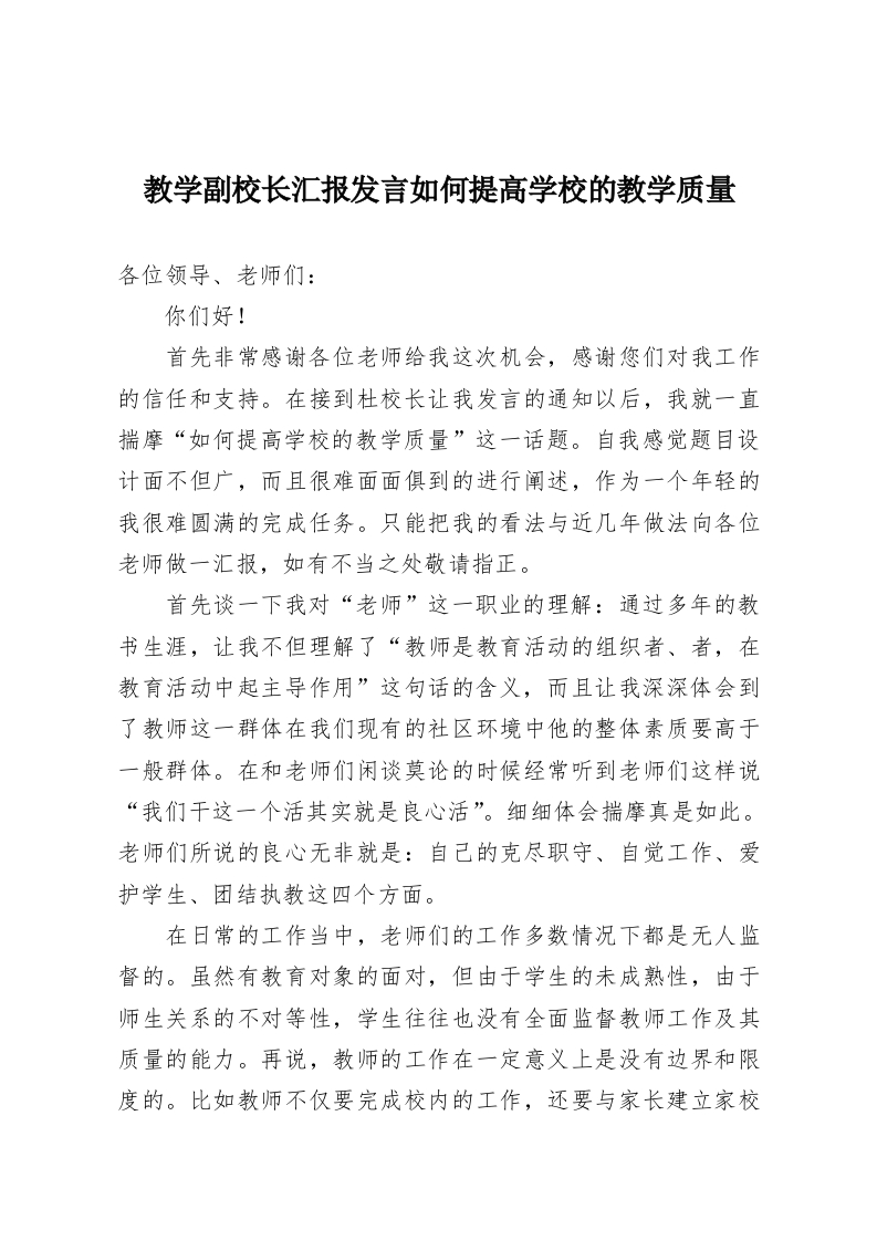 教学副校长汇报发言如何提高学校的教学质量各位领导、老师们:你们好!首先非常感谢各位老师给我这次机会,感谢您们对我工作的信任和支持。在接到杜校长让我发言的通知以后,我就一直揣摩“如何提高学校的教学质量”这一话题。自我感觉题目设计面不但广,而且很难面面俱到的进行阐述,作为一个年轻的我很难圆满的完成任务。只能把我的看法与近几年做法向各位老师做一汇报,如有不当之处敬请指正。首先谈一下我对“老师”这一职业的理解:通过多年的教书生涯,让我不但理解了“教师是教育活动的组织者、者,在教育活动中起主导作用”这句话的含义,而且让我深深体会到了教师这一群体在我们现有的社区环境中他的整体素质要高于一般群体。在和老师们闲谈莫论的时候经常听到老师们这样说“我们干这一个活其实就是良心活”。细细体会揣摩真是如此。老师们所说的良心无非就是:自己的克尽职守、自觉工作、爱护学生、团结执教这四个方面。在日常的工作当中,老师们的工作多数情况下都是无人监督的。虽然有教育对象的面对,但由于学生的未成熟性,由于师生关系的不对等性,学生往往也没有全面监督教师工作及其质量的能力。再说,教师的工作在一定意义上是没有边界和限度的。比如教师不仅要完成校内的工作,还要与家长建立家校