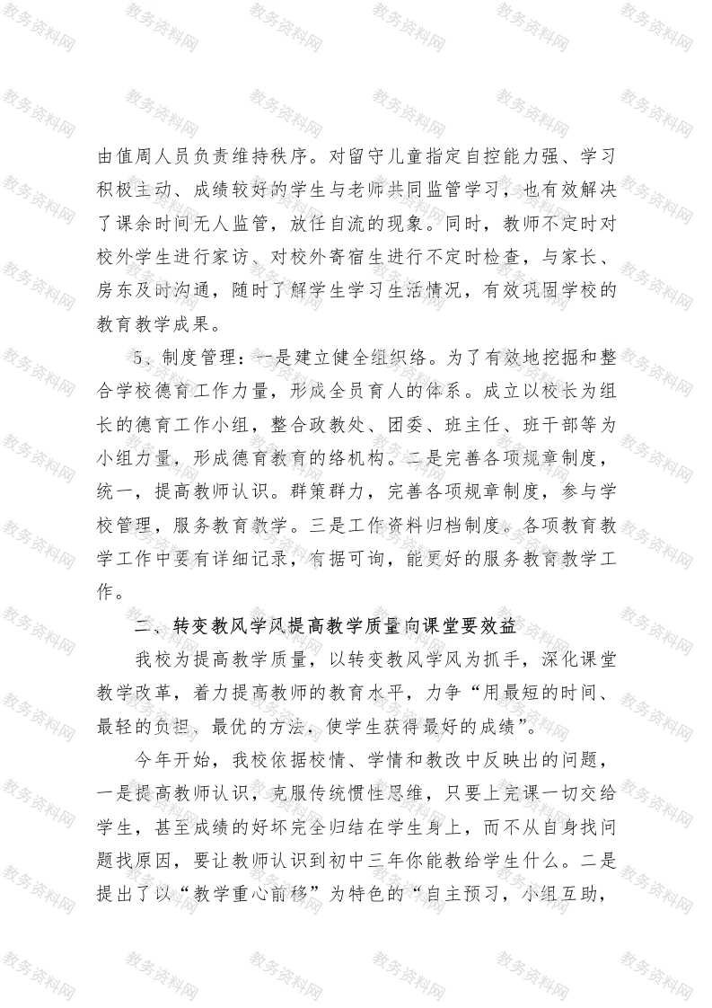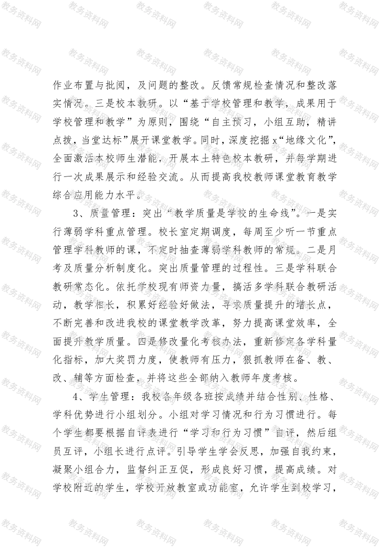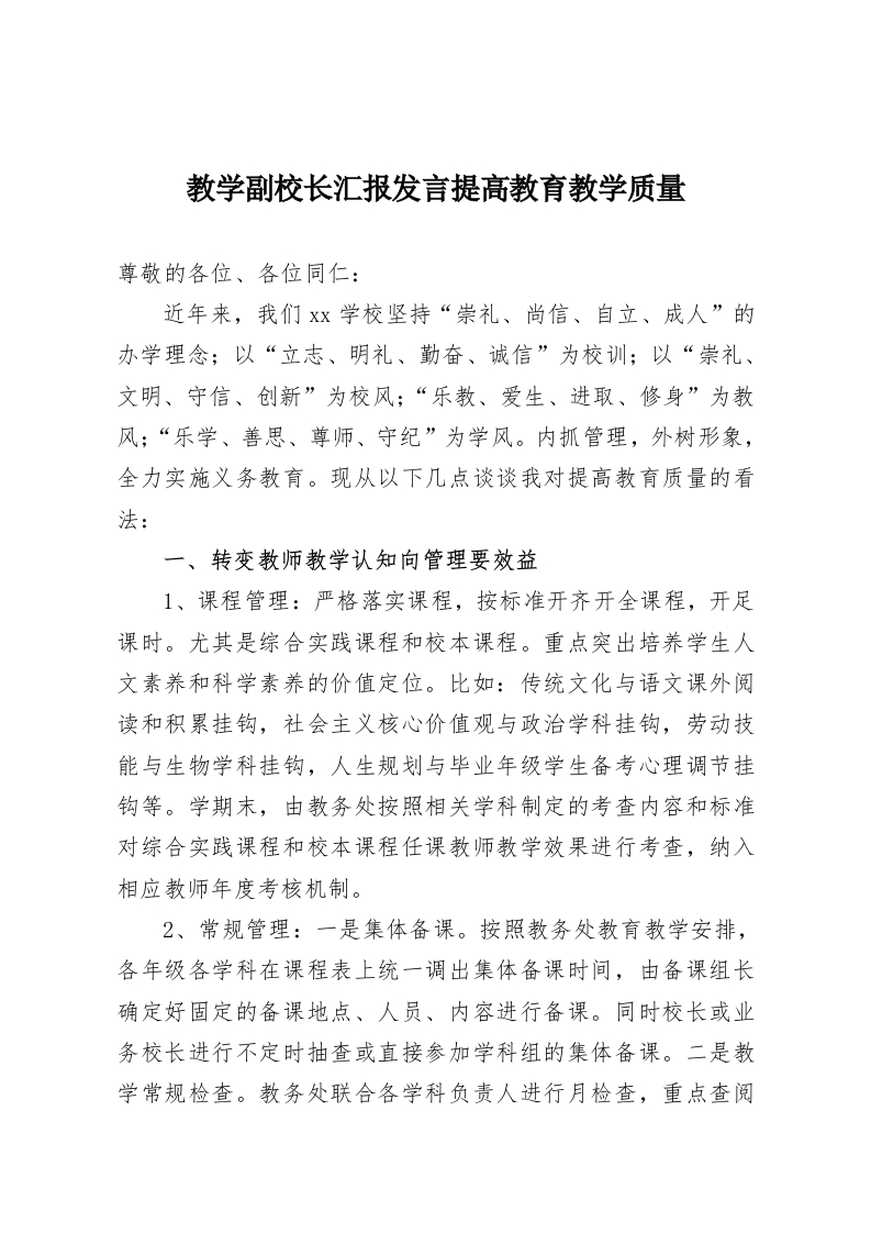 教学副校长汇报发言提高教育教学质量尊敬的各位、各位同仁:近年来,我们xx学校坚持“崇礼、尚信、自立、成人”的办学理念;以“立志、明礼、勤奋、诚信”为校训;以“崇礼、文明、守信、创新”为校风;“乐教、爱生、进取、修身”为教风;“乐学、善思、尊师、守纪”为学风。内抓管理,外树形象,全力实施义务教育。现从以下几点谈谈我对提高教育质量的看法:一、转变教师教学认知向管理要效益1、课程管理:严格落实课程,按标准开齐开全课程,开足课时。尤其是综合实践课程和校本课程。重点突出培养学生人文素养和科学素养的价值定位。比如:传统文化与语文课外阅读和积累挂钩,社会主义核心价值观与政治学科挂钩,劳动技能与生物学科挂钩,人生规划与毕业年级学生备考心理调节挂钩等。学期末,由教务处按照相关学科制定的考查内容和标准对综合实践课程和校本课程任课教师教学效果进行考查,纳入相应教师年度考核机制。2、常规管理:一是集体备课。按照教务处教育教学安排,各年级各学科在课程表上统一调出集体备课时间,由备课组长确定好固定的备课地点、人员、内容进行备课。同时校长或业务校长进行不定时抽查或直接参加学科组的集体备课。二是教学常规检查。教务处联合各学科负责人进行月检查,重点查阅