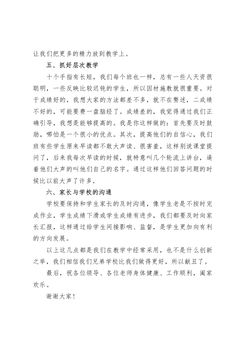 教学经验交流,校长简短发言尊敬的各位领导:大家早上好,我是xx学校的xx老师。今天受中心校的委托代表xxxx学校在这里作教学经验的发言。我想在坐的都是我们县非常优秀的教师,都拥有丰富的教学经验,此时,我心情非常紧张。我作为一名新担任的校长管理工作者,在教学方面无经验可谈,在各位领导面前发言,真是班门弄斧了,恳请各位领导给予指教。教学,是每个学校的工作核心,怎样提高教育教学质量,我想我们每一位教师都苦思冥想过。下面我结合我自己的一些在教学方面的做法跟大家交流一下几个方面。一、兴趣兴趣是最好的老师,我们想要提高学生的教学质量,我觉得首先要从兴趣入手,在课堂上正确的找到教学内容与学生兴趣的内在联系。比如,在上三年级数学的时候,我上到两步连乘的实际应用时,考虑到学生平时都喜欢上体育课,那我就刻意从这些方面出一些题目给他们解答。这样他们就在对自己感兴趣的东西中学到了知识。二、课堂效率我们大家都知道,课堂是我们提高教学质量的关键。抓好了课堂,就等于抓好了教学的一大半。那怎么抓好课堂效率呢?我想我们每个教师都有自己的一套做法。我的做法是这样的: