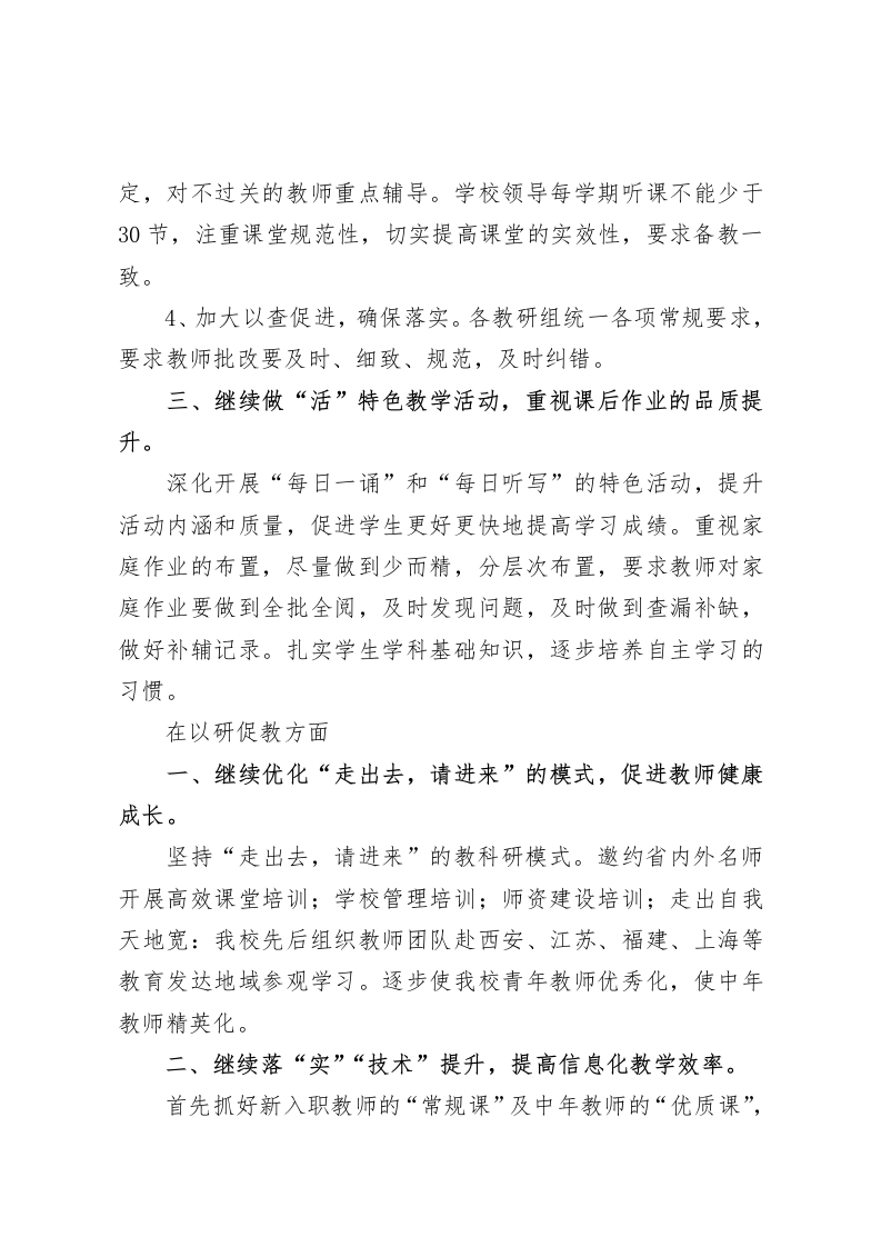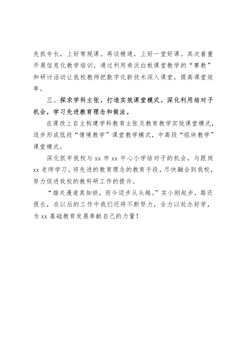 教学质量研讨会,新建学校校长发言将先进的教育理念的教育手段,尽快融合到我校,努力促进我校的教科研工作的提升尊敬的各位领导、各位同仁:作为新建学校,我们将本着学校“自主发展、富实生命”的核心理念,坚守“厚德富学、崇真尚实”的校训,积极探索“自律奋进务求实效”的校风、“博学严谨、创新实干”的教风,积极养成“厚积有恒、勤奋实学”的学风,立足课堂,以严促教,再抓实干。具体举措是:在课堂聚焦方面一、继续做“实”课表,严格执行课程计划。任何人不得随意变更课表,不得随意增加与削减课时总量,坚持每天至少三次巡查,并留记录,每周汇总,定期处理。二、继续做“细”常规教学,保质保量狠抓规范。1、继续深化学习课标,严格按课标规范教学。2、持续深化充足备课制度,优化课堂教学流程。要求有课必备,成立电子备课小组,集体备课,要有统一教案,必须进行二次备课。优化课堂教学流程和效果。教后加强反思复盘,复盘次数要足、质量要高。3、加强随堂听课,备教一致。开展教师“互听互评课”活动,“师徒带教结对”活动,每位教师每学期不少于20节。每学期交流教师准备一节展示课,新分教师在期中和期末各准备一节汇报课。推行随堂听课制度,对新进教师课堂教学等级认