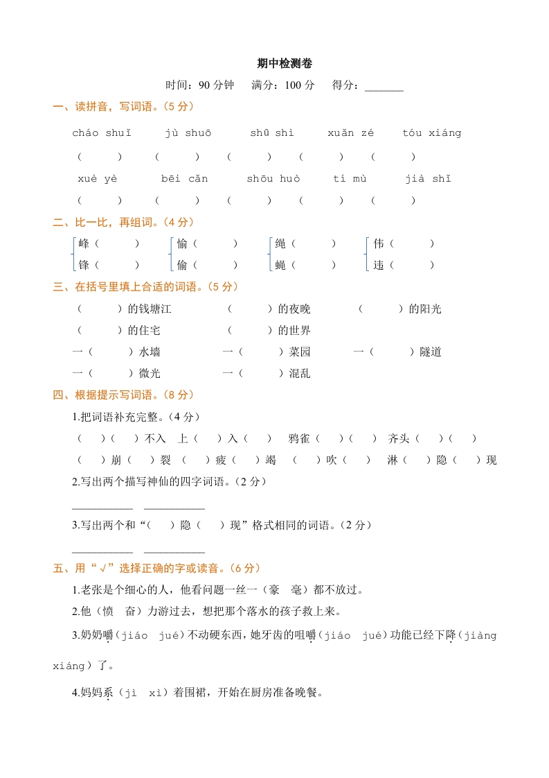 期中检测卷时间:90分钟满分:100分得分:一、读拼音,写词语。(5分)chao shuiju shuoshūshixuan zetou xiang(XuèVèbei canshōuhuòti mujia shi())()二、比一比,再组词。(4分)「峰(「愉(「绳(伟(锋()偷()蝇()违(三、在括号里填上合适的词语。(5分))的钱塘江)的夜晚)的阳光()的住宅()的世界一()水墙一()菜园一()隧道一()微光一()混乱四、根据提示写词语。(8分)1.把词语补充完整。(4分)()()不入上()入()鸦雀()()齐头()()()崩()裂()疲()竭()吹()淋()隐()现2.写出两个描写神仙的四字词语。(2分)3.写出两个和“()隐()现”格式相同的词语。(2分)五、用“√”选择正确的字或读音。(6分)1.老张是个细心的人,他看问题一丝一(豪毫)都不放过。2.他(愤奋)力游过去,想把那个落水的孩子救上来。3.奶奶嚼(jiao jué)不动硬东西,她牙齿的咀嚼(jiao jué)功能已经下降(jiangxiang)了。4.妈妈系(jixi)着围裙,开始在厨房准备晚餐。