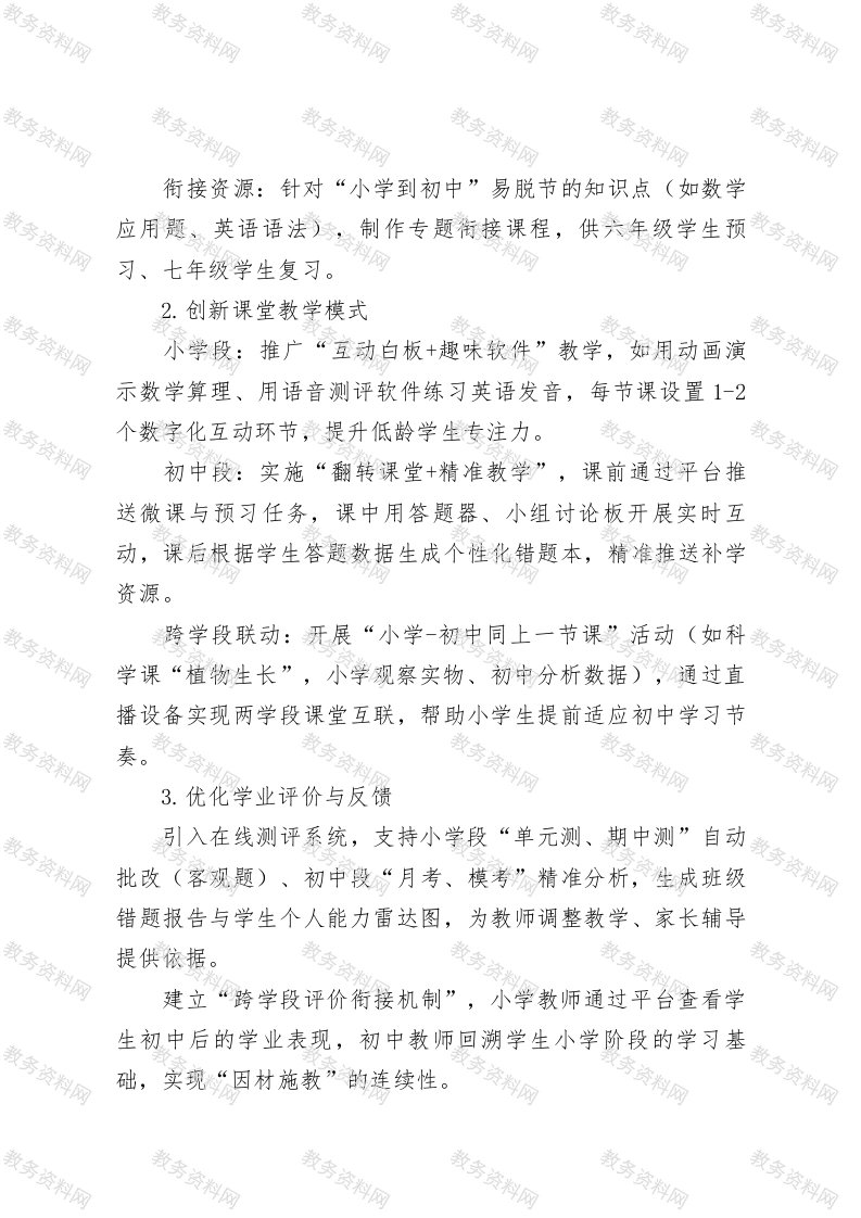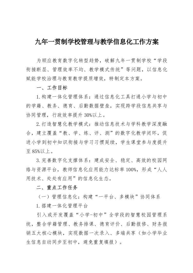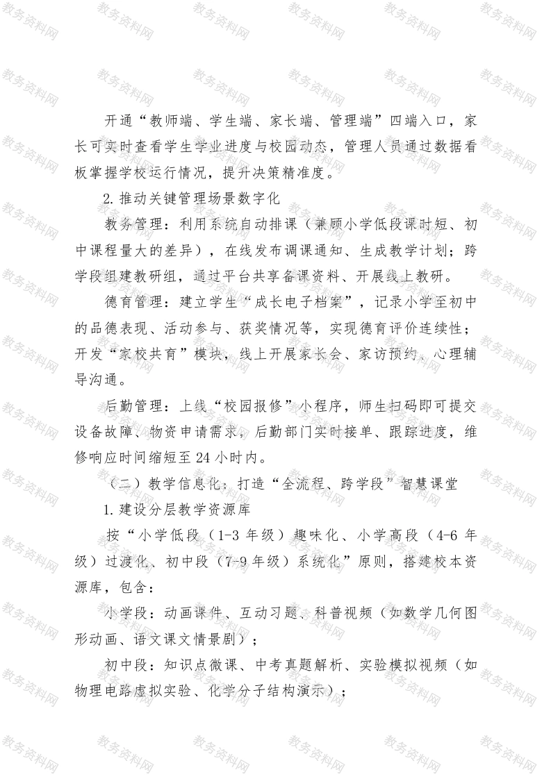 九年一贯制学校管理与教学信息化工作方案为顺应教育数字化转型趋势,破解九年一贯制学校“学段衔接断层、管理效率不均、教学模式传统”等问题,以信息化赋能学校治理与教育教学提质增效,特制定本方案。一、工作目标1.构建一体化管理体系:通过信息化工具打通小学与初中的学籍、教务、德育、后勤数据壁垒,实现跨学段信息共享与协同管理,行政效率提升30%以上。2.打造智慧化教学模式:推动信息技术与学科教学深度融合,建立覆盖“教、学、练、评、测”的数字化教学闭环,促进小学到初中知识衔接与学习习惯延续,学生课堂参与度提升至85%以上。3.完善数字化支撑体系:建成安全、稳定、高效的校园网络与资源平台,教师信息化应用能力达标率100%,形成“人人用技术、处处有应用”的信息化生态。二、重点工作任务(一)管理信息化:构建“一平台、多模块”协同体系1.搭建一体化管理平台引入或开发覆盖“小学-初中”全学段的智慧校园管理系统,整合学籍管理、教务排课、德育评价、后勤报修、财务报销五大核心模块,实现数据一次录入、多端共享(如小学毕业生信息自动同步至初中,避免重复填报)。