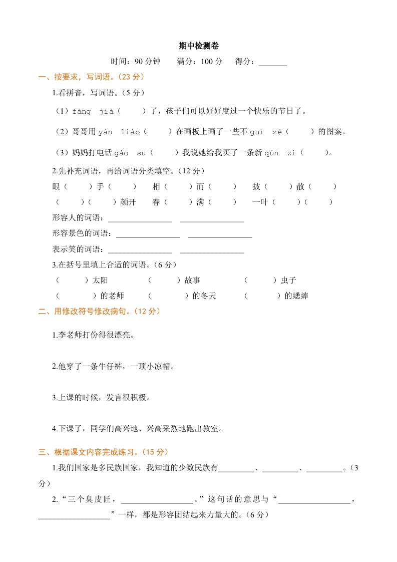 期中检测卷时间:90分钟满分:100分得分:一、按要求,写词语。(23分)1.看拼音,写词语。(5分)(1)fang jia)了,孩子们可以好好度过一个快乐的节日了。(2)哥哥用yan1iao()在画板上画了一些不guizé()的图案。(3)妈妈打电话gao su()我说她给我买了一条新qúnzi()。2.先补充词语,再给词语分类填空。(12分)眼()手(相()而()披()散(()()颜开春()满()一叶()(形容人的词语:形容景色的词语:表示笑的词语:3.在括号里填上合适的词语。(6分)()太阳()故事)虫子()的老师)的冬天)的蟋蟀二、用修改符号修改病句。(12分)】1.李老师打份得很漂亮。2他穿了一条牛仔裤,一顶小凉帽。3.上课的时候,发言很积极。4.下课了,同学们高兴地、兴高采烈地跑出教室。三、根据课文内容完成练习。(15分)1.我们国家是多民族国家,我知道的少数民族有(3分)2.“三个臭皮匠,。”这句话的意思与“”一样,都是形容团结起来力量大的。(6分)