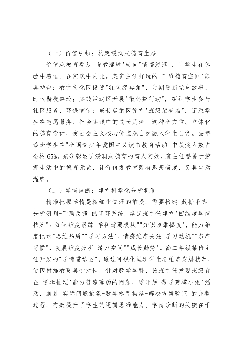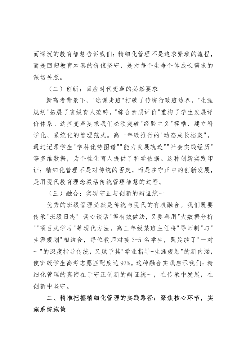 校长在高中班主任精细化管理培训会上的讲话:守正创新育新人各位班主任同仁:大家上午好!今天我们以"高中班主任精细化管理"为主题开展专题培训,既是对教育初心的时代叩问,也是对育人使命的深度践行。当前,教育改革已进入"深水区”,新高考带来的不仅是考试形式的变化,更是育人方式的根本变革。作为班级育人的第一责任人,我们既要传承"捧着一颗心来,不带半根草去"的教育情怀,又要具备"精准滴灌、精耕细作"的专业能力。今天,我将围绕"为何要精细化管理"如何实现精细化管理"怎样提升精细化管理能力”三个维度,与大家共同探索新时代班级育人的守正创新之路,让每个学生都能在精心呵护下绽放生命光彩。一、深刻认识精细化管理的时代内涵:守教育之正,创管理之新(一)守正:坚守班级育人的本质追求教育的根本在于育人,班级管理的初心始终是促进学生全面发展。无论教育形态如何变革,"立德树人"的根本任务不能变,"以生为本"的教育理念不能丢,"严慈相济"的教育艺术不能忘。去年退休的李老师在班主任岗位上坚守38年,他创立的"每日三问”(今天学到了什么、帮助了谁、提升了哪些品格)育人模式,虽无复杂形式,却让历届学生受益终身。这种质朴