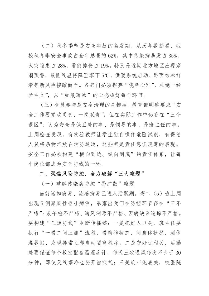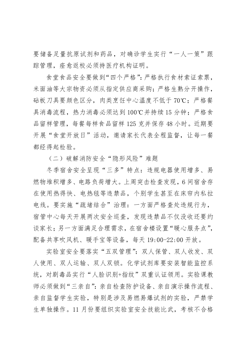 校长在秋冬季校园安全工作专题会议上的讲话:破解“三叠加”风险,筑牢“四防线”一一以“时时放心不下”之责守护万余名师生平安各位老师、同志们:今天我们召开这场安全专题会议,正值秋尽冬来的关键节点。当前校园安全形势呈现“三个叠加”的严峻态势:一是季节交替期与传染病高发期叠加,流感、支原体肺炎等病原体活动频繁;二是期中复习备考与学生心理波动期叠加,情绪管理压力陡增;三是设施设备高负荷运行与极端天气多发期叠加,隐患排查难度加大。据校医院统计,上周全校病假学生较上月增长40%,宿舍违规电器检查发现问题12起,这些数据警示我们:安全工作绝不能有丝毫松懈。今天的会议就是要以“时时放心不下”的责任感,聚焦“三个关键”,破解“三大难题”,筑牢“四道防线”,确保校园安全稳定。一、提高政治站位,深刻认识“三个关键”的极端重要性(一)安全是办学治校的生命线。习近平总书记强调“人民至上、生命至上”,校园安全更是关系千家万户幸福的“底线工程”。去年某高校实验室爆炸事故造成3名学生遇难,某中学食品安全事件导致200余名师生腹泻,这些惨痛教训反复证明:安全工作没有“及格线”,只有“满分”与“零分”的区别。我们要清醒认识到,一所学校如果连师生的生命安全都保障不了,再高的教学质量、再多的荣誉奖牌都是“空中楼阁”。