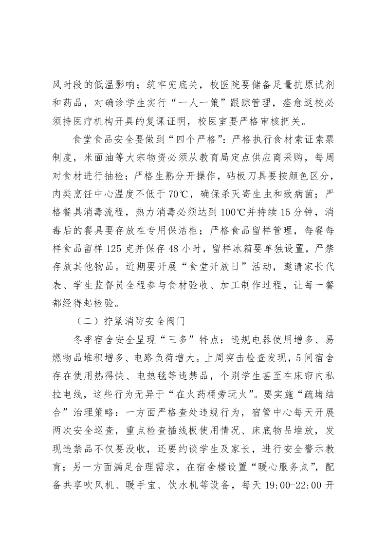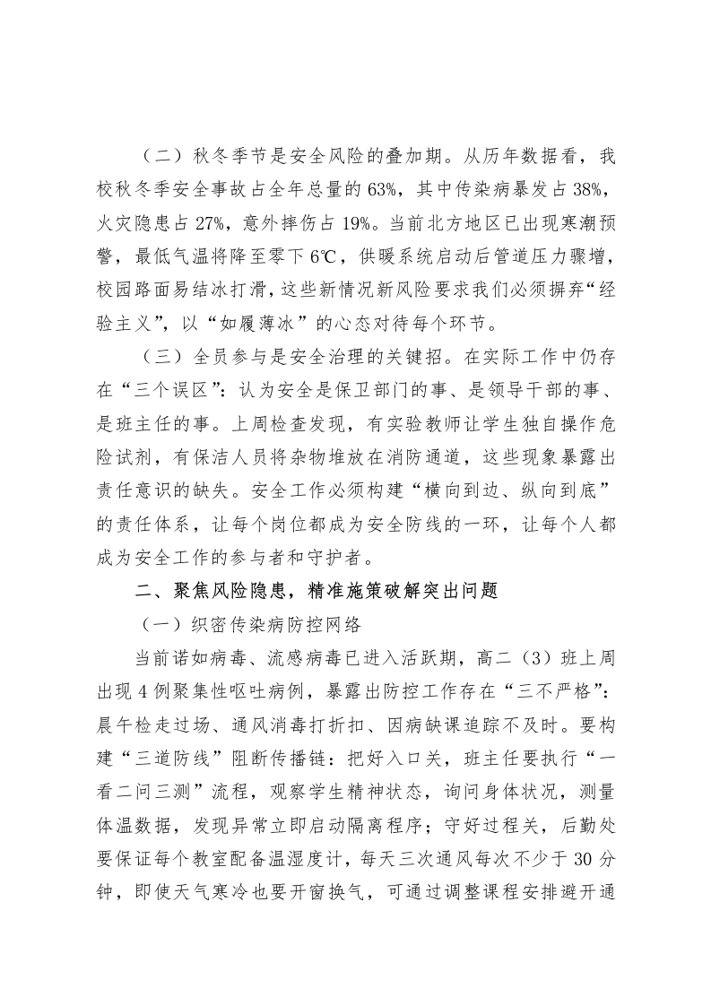 校长在秋冬季校园安全工作专题会议上的讲话:于细微处见真章,以恒常心守平安各位老师、同志们:今天我们召开这场安全专题会议,正值秋尽冬来的关键节点。校园安全如同空气与阳光,拥有时不觉珍贵,失去时方知不可或缺。近期校园安全呈现“三碰头”态势:季节交替带来的传染病风险与学生心理波动期交织,设施设备高负荷运行与极端天气多发叠加,常规管理漏洞与突发隐患并存。据校医院统计,上周全校因病缺课学生较上月增长35%,宿舍安全检查发现违规电器9起,这些数据警示我们:安全工作没有“休止符”,必须时刻保持“进行时”。今天的会议就是要以“时时放心不下”的责任感,于细微处查隐患,于寻常处筑防线,让安全成为校园最坚实的底色。一、提高政治站位,深刻把握安全工作的极端重要性(一)安全是办学治校的生命线。习近平总书记强调“发展决不能以牺牲人的生命为代价”,这一重要论述同样适用于教育领域。去年某高校实验室爆炸事故造成2名学生死亡,某中学食品安全事件导致150余名师生就医,这些惨痛教训反复证明:一所学校的教育质量再高,只要发生安全事故,所有成绩都会归零。我们要清醒认识到,安全不是附加题而是必答题,不是选择题而是判断题,必须以“万无一失”的标准和“一失万无”的警醒抓好落实。