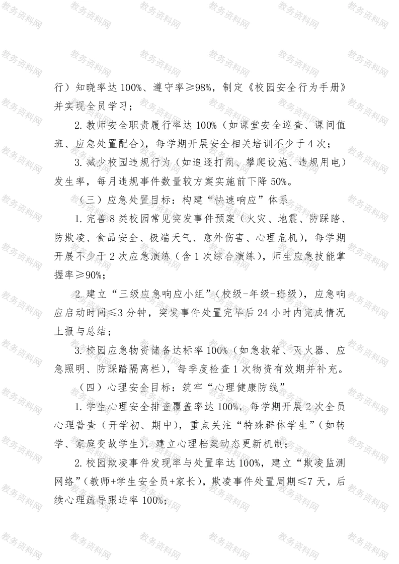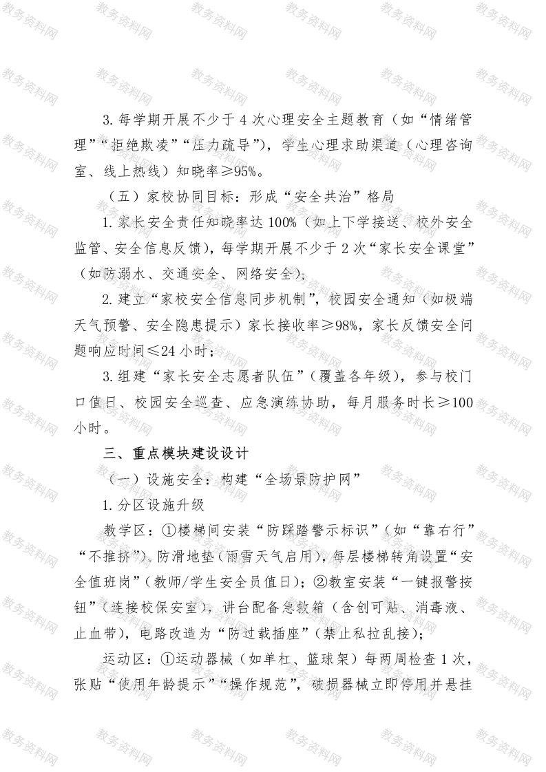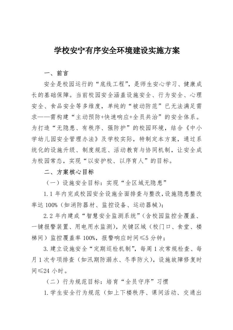 学校安宁有序安全环境建设实施方案一、前言安全是校园运行的“底线工程”,是师生安心学习、健康成长的基础保障。当前校园安全涵盖设施安全、行为安全、心理安全、食品安全等多维度,单纯的“被动防范”已无法满足需求一一需构建“主动预防+快速响应+全员共治”的安全体系。为打造“无隐患、有秩序、强防护”的校园环境,结合《中小学幼儿园安全管理办法》及学校实际,特制定本方案,通过系统化的设施升级、制度规范、活动教育与协同机制,让安全成为校园常态,实现“以安护校、以序育人”的目标。二、方案核心目标(一)设施安全目标:实现“全区域无隐患”1.1年内完成校园安全设施全面排查与整改,设施隐患整改率达100%(如消防器材、监控设备、运动器械):2.2年内建成“智慧安全监测系统”(含校园监控全覆盖、一键报警装置、用电用水监测),关键区域(校门口、食堂、楼梯间)监控覆盖率100%,报警响应时间≤5分钟;3.建立设施安全“定期巡检机制”,每周1次常规检查、每月1次专项排查(如汛期防溺水、冬季防火),设施故障修复时间≤24小时。(二)行为规范目标:培育“全员守序”习惯1.学生安全行为规范(如上下楼秩序、课间活动、交通出