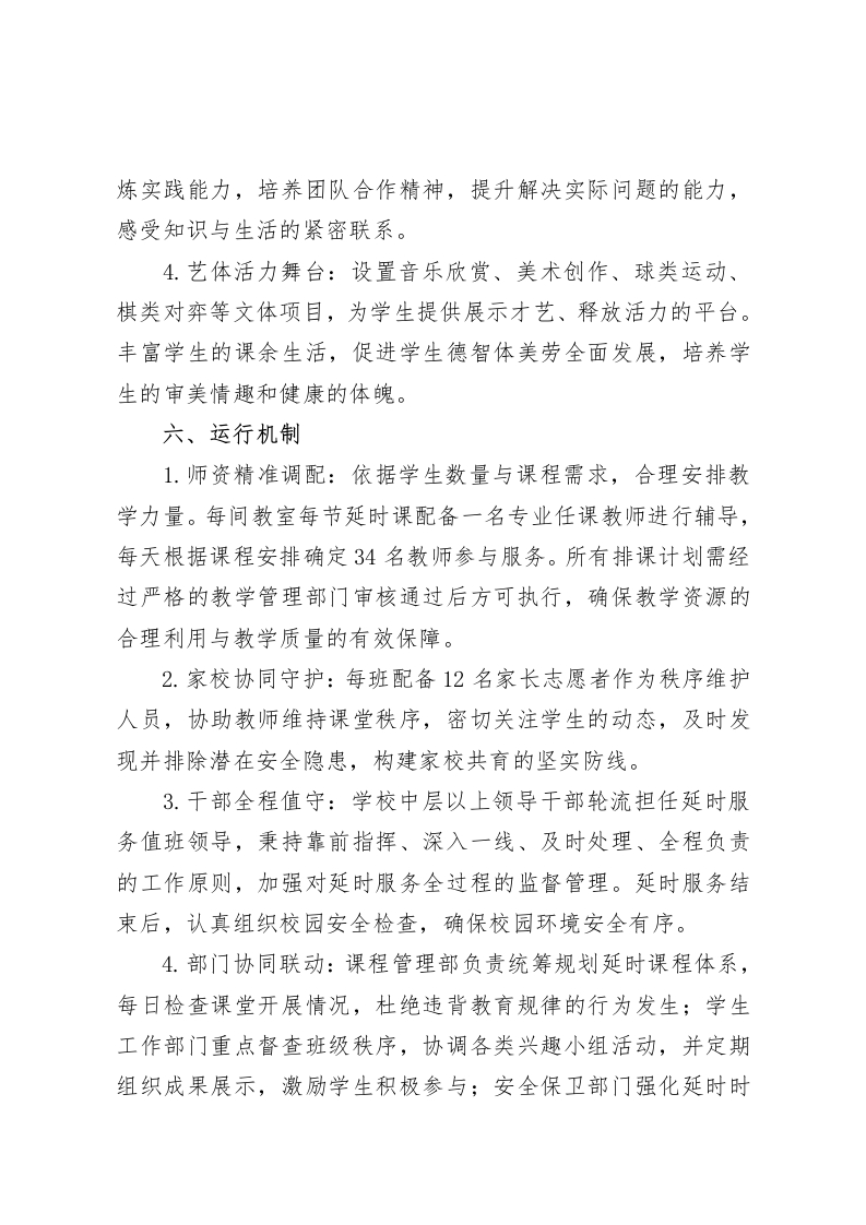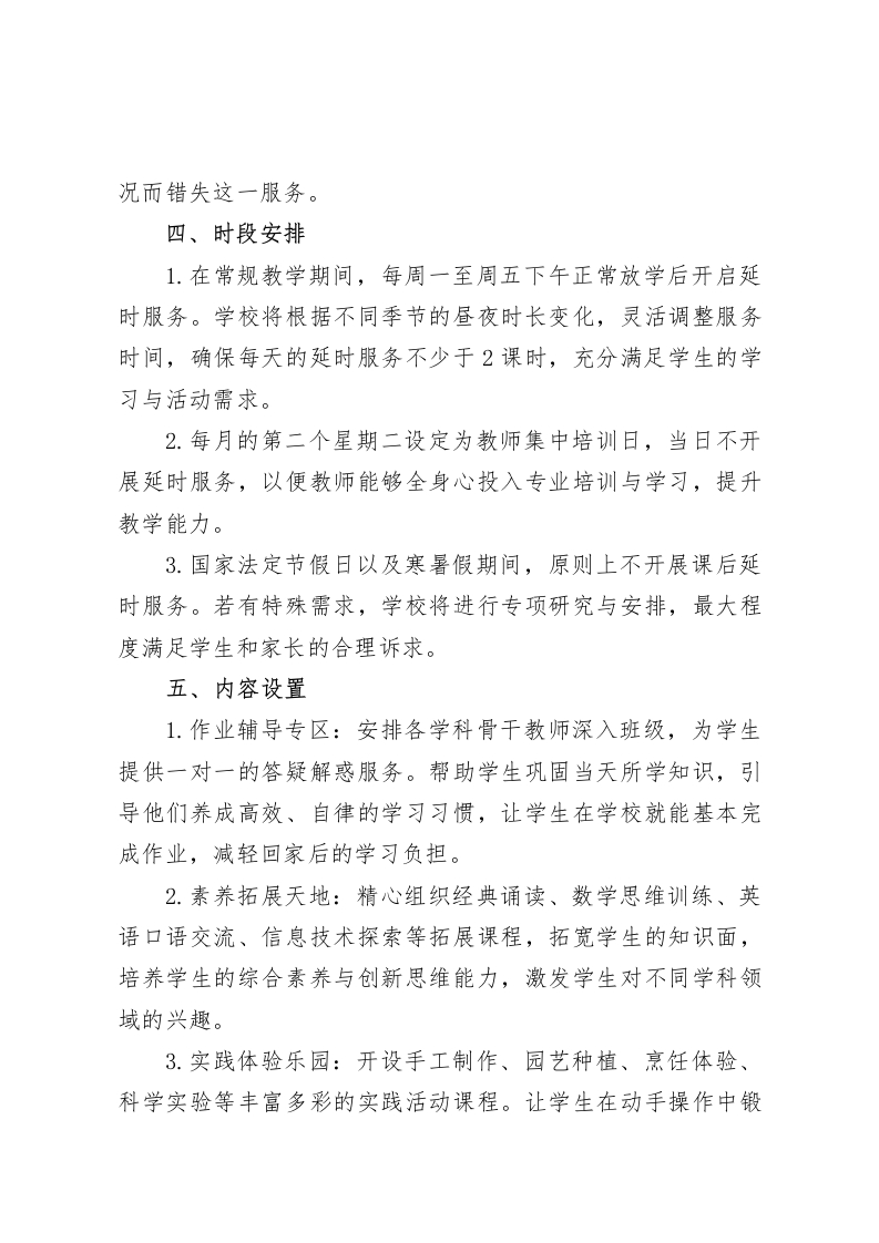 学校课后延时津贴分配方案(2025年修订)在国家“双减”政策全面推进的大背景下,为积极响应减轻义务教育阶段学生作业负担与校外培训负担的号召,切实解决家长们关心的子女放学后无人照料的难题,我校充分发挥学校在立德树人方面的主阵地作用,积极构建校内校外协同育人的良好格局。结合我校的实际办学情况与师资力量,在实现课后延时服务全面覆盖的基础上,特制定本《XX学校课后延时津贴分配方案》,旨在规范延时服务的运行管理,充分保障参与延时工作教师的合法权益。一、工作目标以育人为核心,以服务为宗旨,全力打造一个内容丰富多元、形式灵活多样、管理科学规范的课后延时服务体系。通过这一体系,有效缓解家长的后顾之忧,为学生提供个性化发展的广阔空间,同时推动学校内涵式发展迈向新台阶。二、实施准则秉持学生自主选择、家长自愿参与、教师自觉奉献、学校统筹规划的原则,确保课后延时服务能够精准覆盖每一个有需求的家庭,真正实现教育的公平性与普惠性。三、覆盖范围课后延时服务面向全校所有在册学生,尤其关注单亲家庭子女、外来务工人员子女以及隔代抚养儿童等特殊群体的实际需求,做到应延尽延、应管尽管,不让任何一个学生因家庭情