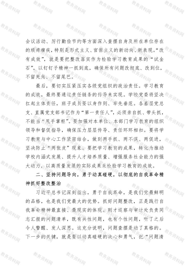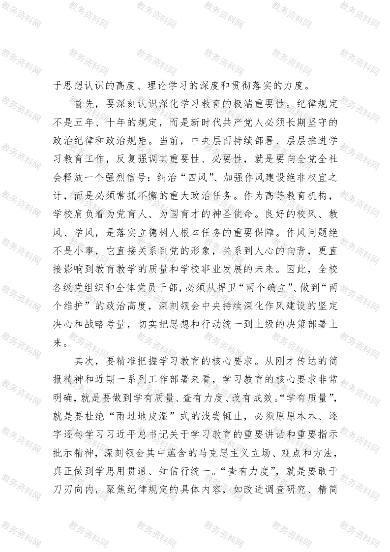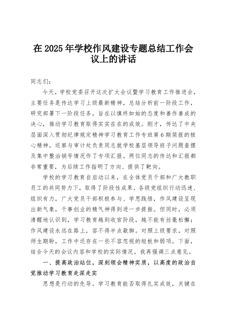 在2025年学校作风建设专题总结工作会议上的讲话同志们:今天,学校党委召开这次扩大会议暨学习教育工作推进会,主要任务是传达学习上级最新精神,总结分析前一阶段工作,研究部署下一阶段任务,旨在以慎终如始的态度和善作善成的决心,推动学习教育取得实实在在的成效。刚才,传达了中央层面深入贯彻纪律规定精神学习教育工作专班第6期简报的核心精神,巡察与审计处负责同志就学校基层领导班子问题查摆及集中整治销号情况作了专项汇报。两位同志的传达和汇报都非常重要,为后续工作指明了方向、提供了靶向。学校的学习教育自启动以来,在全体党员干部和广大教职员工的共同努力下,取得了阶段性成果。各级党组织行动迅速、组织有力,广大党员干部积极参与、学思践悟,作风建设呈现出新气象,干事创业的精气神得到进一步提振。但同时,必须清醒地认识到,学习教育越到收官阶段,越不能有丝毫松懈;作风建设永远在路上,容不得半点歇脚。对照上级要求,对照师生期盼,工作中还存在一些不容忽视的短板和弱项。下面,结合今天的会议内容和学校的实际情况,我再强调三点意见。一、提高政治站位,深刻领会精神实质,以高度的政治自觉推动学习教育走深走实思想是行动的先导。学习教育能否取得扎实成效,关键在