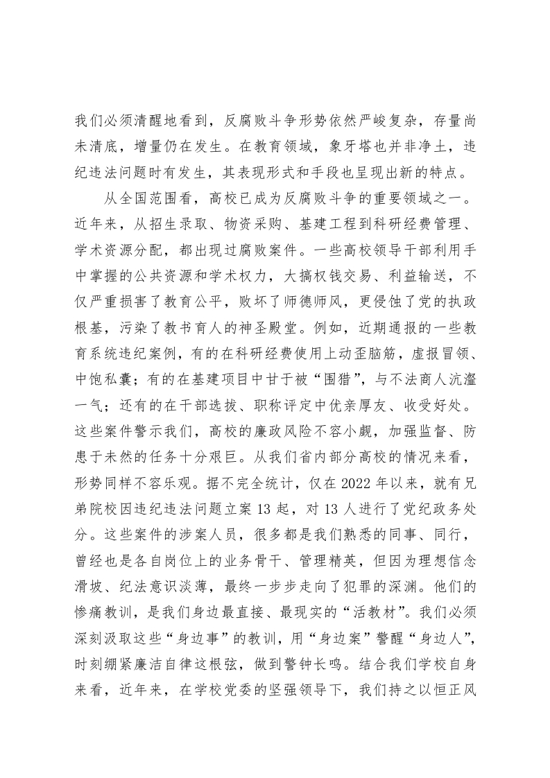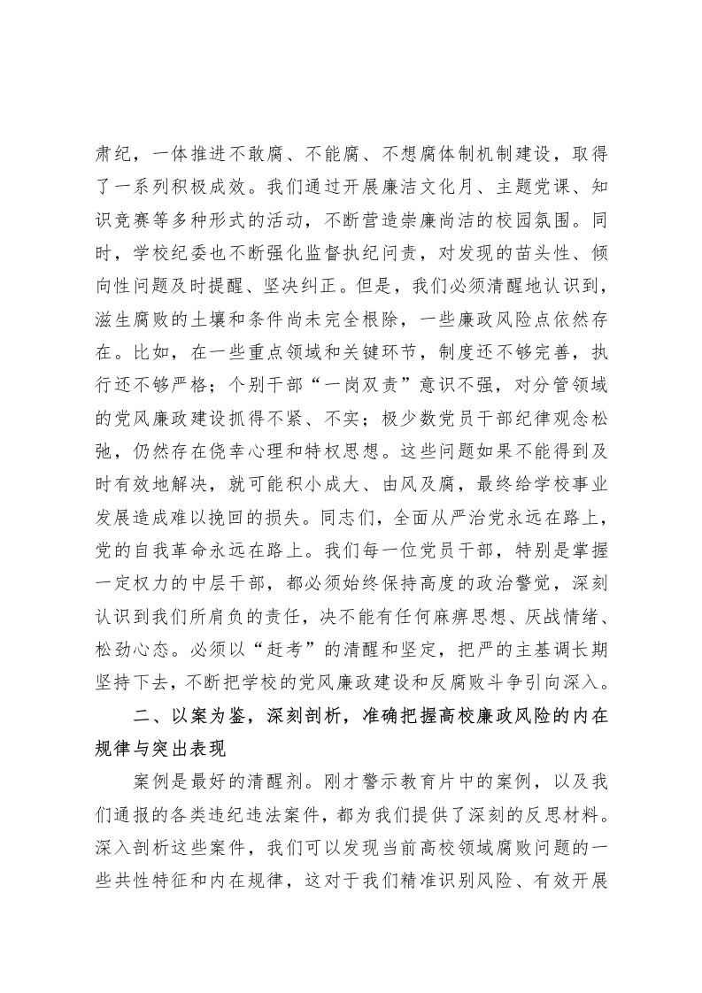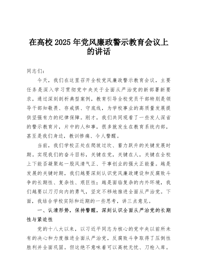 在高校2025年党风廉政警示教育会议上的讲话同志们:今天,我们在这里召开全校党风廉政警示教育会议,主要任务是深入学习贯彻党中央关于全面从严治党的新部署新要求,通过深刻剖析典型案例,教育引导全校党员干部特别是领导干部知敬畏、存戒惧、守底线,为学校事业的高质量发展提供坚强有力的纪律保障。刚才,我们共同观看了一些发人深省的警示教育片,片中的人和事,很多就发生在教育系统内部,甚至是我们身边,教训惨痛、令人警醒。当前,我们学校正处在爬坡过坎、蓄力跃升的关键发展时期。实现我们的奋斗目标,关键在党,关键在人,关键在全校上下能否凝聚起一股风清气正、干事创业的强大正能量。越是发展的关键时期,我们越要深刻认识党风廉政建设和反腐败斗争的长期性、复杂性、艰巨性;越是面临复杂的内外环境,我们越要以刀刃向内的勇气,坚定不移地推进全面从严治党。下面,我结合学校实际和近期的一些思考,讲三点意见。一、认清形势,保持警醒,深刻认识全面从严治党的长期性与紧迫性党的十八大以来,以习近平同志为核心的党中央以前所未有的决心和力度推进全面从严治党,反腐败斗争取得了压倒性胜利并全面巩固。但这绝不意味着可以高枕无忧、刀枪入库。