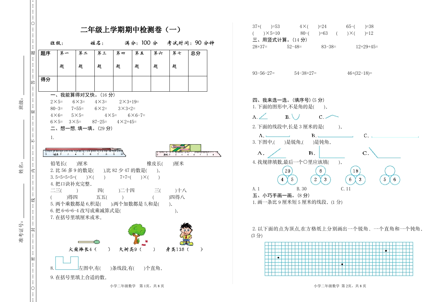 :::二年级上学期期中检测卷(一)37+()=534×(=2465-()=38()×5=1080-()=63()×(=12班级:姓名:满分:100分考试时间:90分钟三、用竖式计算。(14分)28+37=52-48=83-38=12+29+45=题序第一第二第三第四第五第六第七总分··:题题题题93-56-27=54-38+2746+(32-18)得分一、我能算得对又快。(16分)2×5=6×3=4×3=2×3+19四、我来选一选。(填序号)(5分)80-3=7+556×2=3×3+21.下面的图形中,不是角的是().好4×6=5×5=4×5=6×6-7=A.∠B.C.6×5=3×5=87-25=4×2+45二、想一想填一填。(29分)2.下面的线段中,长是3厘米的是(1..C长3.下图中.()是锐角.()是钝角:片T性装)八B.铅笔长()厘米橡皮长()厘米4.找规律填数,最后一个O里应该填(2.比56多9的数是(,比82少47的数是(20183.5+5+5+5=()X7+7=()×(4Y56义364.把口决补充完整。二三(四()二十四三()十八A.1B.30C.11()得四五五()四得八五、小巧手画一画。(8分)5.两个乘数都是6,积是(两个加数都是5,和是(1.画一条比9厘米短5厘米的线段。(1分):6.把6+6+6-4改写成乘减算式是(·:7.在括号里填厘米或米。2.以下面的点为顶点,在方格纸上分别画出一个锐角、一个直角和一个钝角3分)火柴棒长4(大树高9(身高136(:8.左图中,有()条线段,有()个直角9.在括号里填上合适的数小学二年级数学第1页,共8页小学二年级数学第2页,共8页