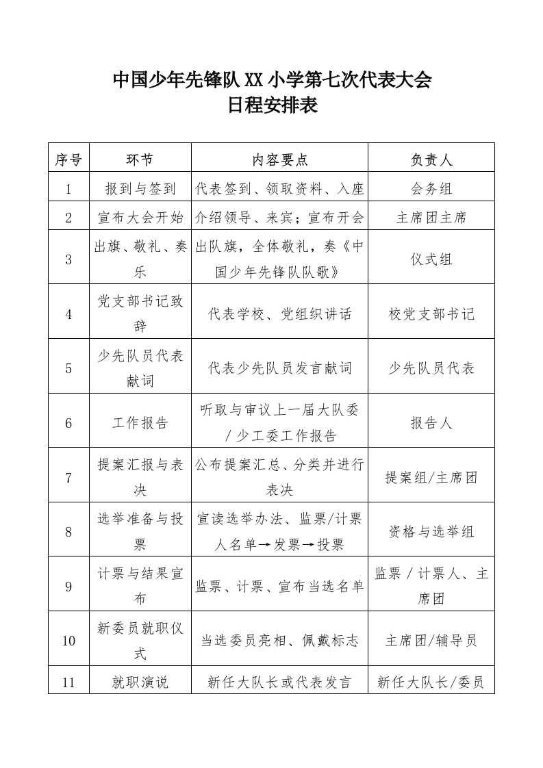 中国少年先锋队x小学第七次代表大会日程安排表序号环节内容要点负责人1报到与签到代表签到、领取资料、入座会务组2宣布大会开始介绍领导、来宾;宣布开会主席团主席出旗、敬礼、奏出队旗,全体敬礼,奏《中3仪式组乐国少年先锋队队歌》党支部书记致4代表学校、党组织讲话校党支部书记辞少先队员代表5代表少先队员发言献词少先队员代表献词听取与审议上一届大队委6工作报告报告人/少工委工作报告提案汇报与表公布提案汇总、分类并进行7提案组/主席团决表决选举准备与投宣读选举办法、监票/计票8资格与选举组票人名单一发票→投票计票与结果宣监票/计票人、主9监票、计票、宣布当选名单布席团新委员就职仪10当选委员亮相、佩戴标志主席团/辅导员式11就职演说新任大队长或代表发言新任大队长/委员