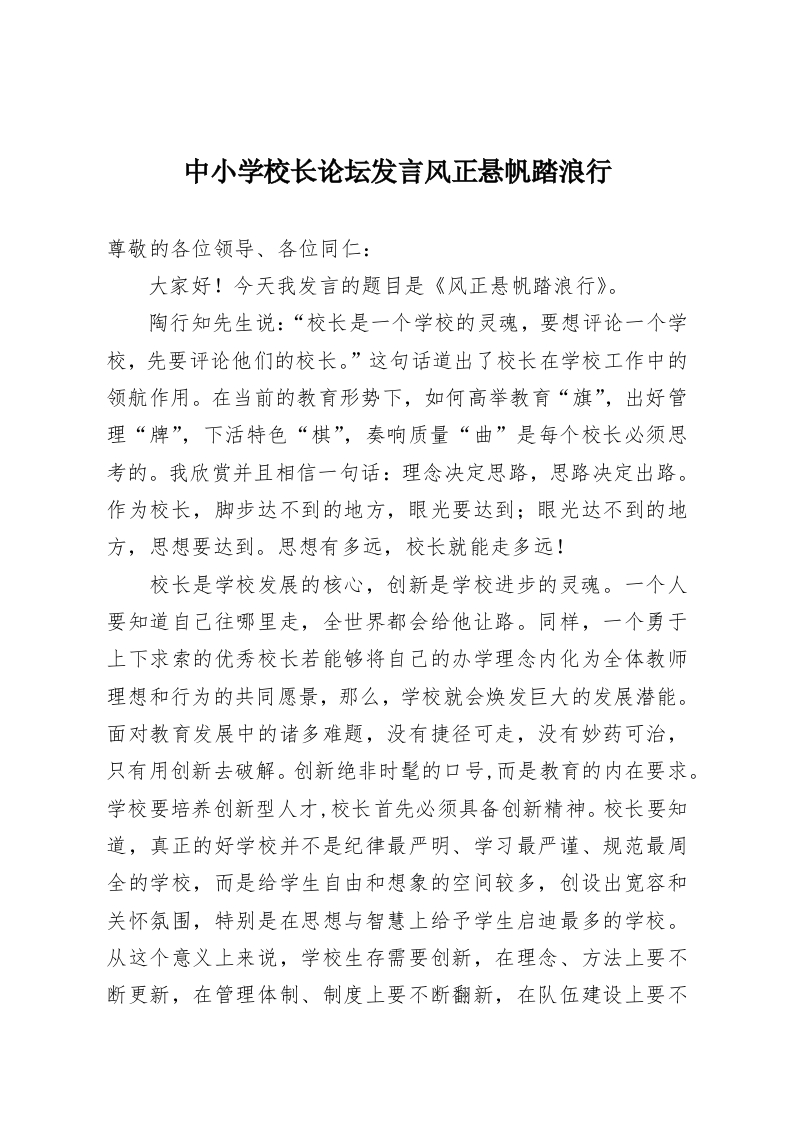 中小学校长论坛发言风正悬帆踏浪行尊敬的各位领导、各位同仁:大家好!今天我发言的题目是《风正悬帆踏浪行》。陶行知先生说:“校长是一个学校的灵魂,要想评论一个学校,先要评论他们的校长。”这句话道出了校长在学校工作中的领航作用。在当前的教育形势下,如何高举教育“旗”,出好管理“牌”,下活特色“棋”,奏响质量“曲”是每个校长必须思考的。我欣赏并且相信一句话:理念决定思路,思路决定出路。作为校长,脚步达不到的地方,眼光要达到:眼光达不到的地方,思想要达到。思想有多远,校长就能走多远!校长是学校发展的核心,创新是学校进步的灵魂。一个人要知道自己往哪里走,全世界都会给他让路。同样,一个勇于上下求索的优秀校长若能够将自己的办学理念内化为全体教师理想和行为的共同愿景,那么,学校就会焕发巨大的发展潜能。面对教育发展中的诸多难题,没有捷径可走,没有妙药可治,只有用创新去破解。创新绝非时髦的口号,而是教育的内在要求。学校要培养创新型人才,校长首先必须具备创新精神。校长要知道,真正的好学校并不是纪律最严明、学习最严谨、规范最周全的学校,而是给学生自由和想象的空间较多,创设出宽容和关怀氛围,特别是在思想与智慧上给予学生启迪最多的学校。从这个意义上来说,学校生存需要创新,在理念、方法上要不断更新,在管理体制、制度上要不断翻新,在队伍建设上要不