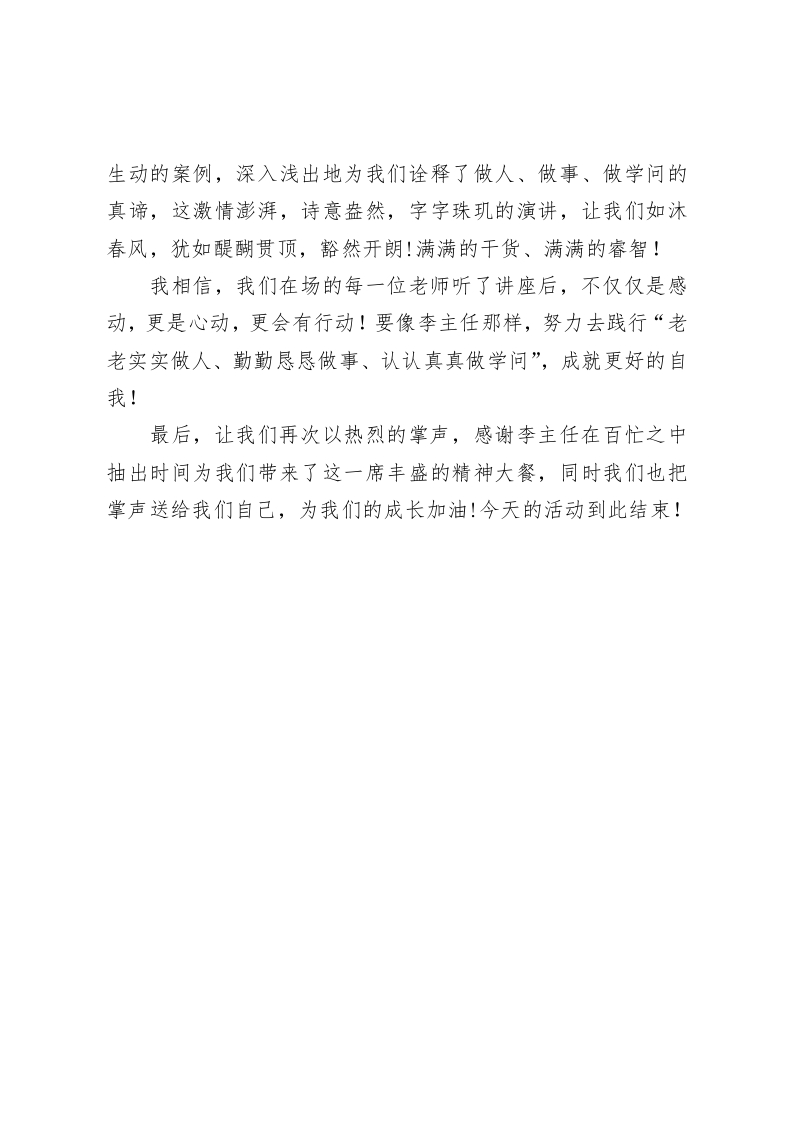 专家来校做讲座,校长致开场白和结束语开场白一一尊敬的各位领导,各位老师:大家下午好!尽管外边春寒料峭,但我们的现场却春意盎然,我们满怀热情地聚在一起为自己的个人素质提升,专业成长汲取养分、蓄势赋能。在我们每一个教师的心中或多或少地一直存在着这样几个州问号:怎样做人,怎样做事,如何做学问?这三者又怎样去协调?怎样互融共通,实现我们有意义的教育人生?当我们满怀这些困惑的时候,我们非常幸运地邀请到了Xx省特级教师李主任来为我们答疑解惑,指点迷津。让我们用掌声来代替我们的心声,欢迎李主任的到来!介绍李主任(略),近年来,李主任努力践行“老老实实做人、勤勤恳恳做事、认认真真做学问”的做人标准和做事、做学问的要求,我们相信,李主任的讲座,一定会拨开我们心头的疑云,让我们更加明朗地大步前行!闲言少叙,下面,我们把时间留给李主任,让我们以热烈的掌声欢迎李主任为我们做精彩讲座!结束语一时间飞快,就这么不经意地过去了,我相信大家都还意犹未尽。刚才李主任用富有哲理的寓言,发人深省的故事,鲜活