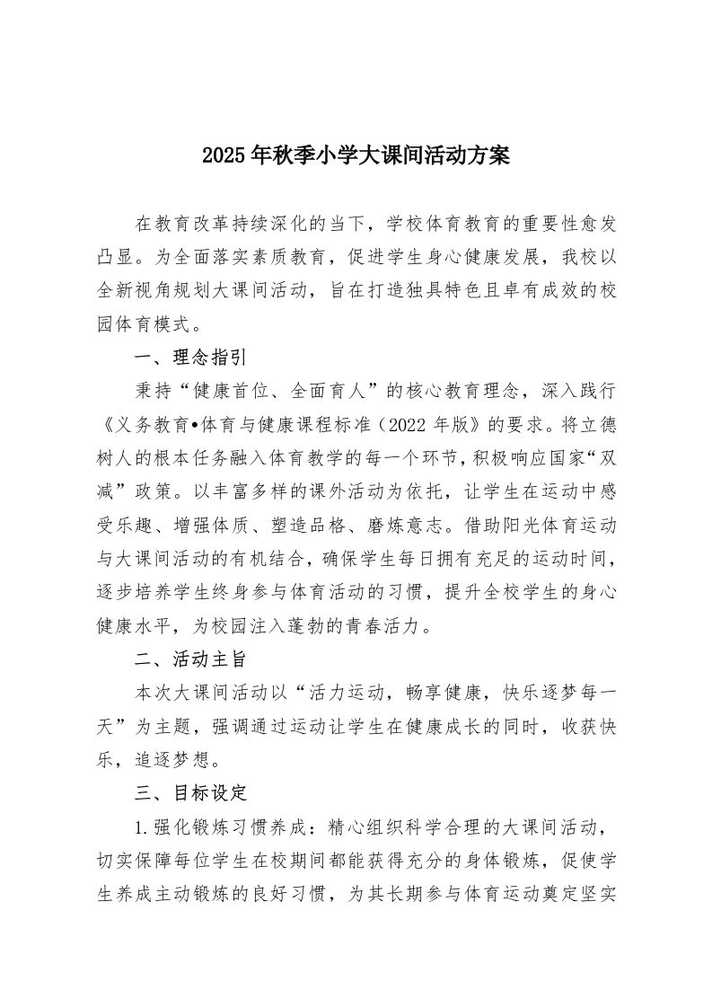 2025年秋季小学大课间活动方案在教育改革持续深化的当下,学校体育教育的重要性愈发凸显。为全面落实素质教育,促进学生身心健康发展,我校以全新视角规划大课间活动,旨在打造独具特色且卓有成效的校园体育模式。一、理念指引秉持“健康首位、全面育人”的核心教育理念,深入践行《义务教育•体育与健康课程标准(2022年版》的要求。将立德树人的根本任务融入体育教学的每一个环节,积极响应国家“双减”政策。以丰富多样的课外活动为依托,让学生在运动中感受乐趣、增强体质、塑造品格、磨炼意志。借助阳光体育运动与大课间活动的有机结合,确保学生每日拥有充足的运动时间,逐步培养学生终身参与体育活动的习惯,提升全校学生的身心健康水平,为校园注入蓬勃的青春活力。二、活动主旨本次大课间活动以“活力运动,畅享健康,快乐逐梦每一天”为主题,强调通过运动让学生在健康成长的同时,收获快乐,追逐梦想。三、目标设定1.强化锻炼习惯养成:精心组织科学合理的大课间活动,切实保障每位学生在校期间都能获得充分的身体锻炼,促使学生养成主动锻炼的良好习惯,为其长期参与体育运动奠定坚实