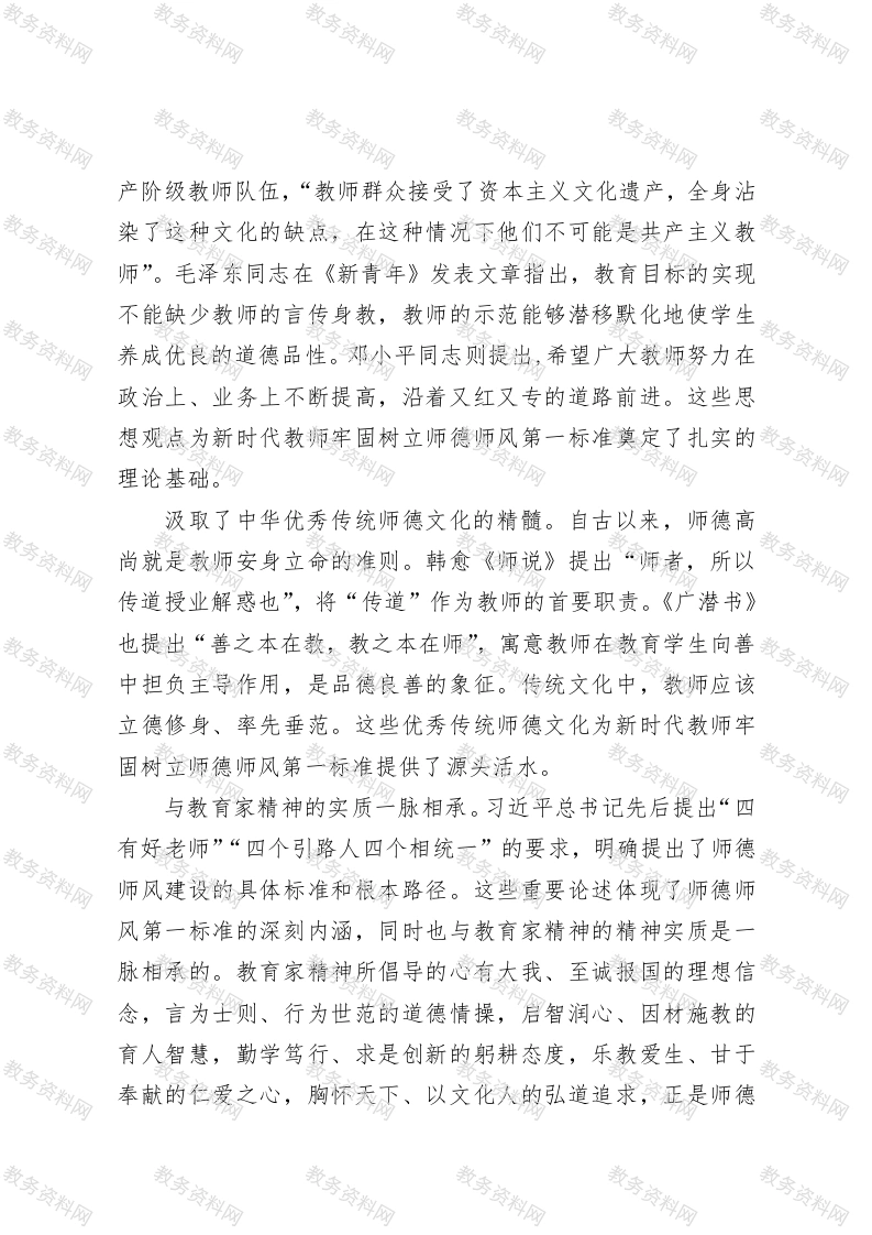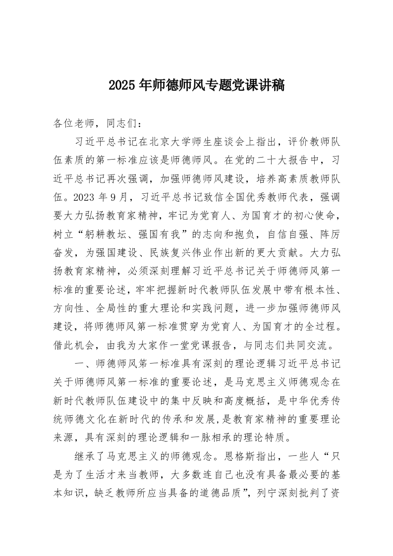 2025年师德师风专题党课讲稿各位老师,同志们:习近平总书记在北京大学师生座谈会上指出,评价教师队伍素质的第一标准应该是师德师风。在党的二十大报告中,习近平总书记再次强调,加强师德师风建设,培养高素质教师队伍。2023年9月,习近平总书记致信全国优秀教师代表,强调要大力弘扬教育家精神,牢记为党育人、为国育才的初心使命,树立“躬耕教坛、强国有我”的志向和抱负,自信自强、阵厉奋发,为强国建设、民族复兴伟业作出新的更大贡献。大力弘扬教育家精神,必须深刻理解习近平总书记关于师德师风第一标准的重要论述,牢牢把握新时代教师队伍发展中带有根本性、方向性、全局性的重大理论和实践问题,进一步加强师德师风建设,将师德师风第一标准贯穿为党育人、为国育才的全过程。借此机会,由我为大家作一堂党课报告,与同志们共同交流。一、师德师风第一标准具有深刻的理论逻辑习近平总书记关于师德师风第一标准的重要论述,是马克思主义师德观念在新时代教师队伍建设中的集中反映和高度概括,是中华优秀传统师德文化在新时代的传承和发展,是教育家精神的重要理论来源,具有深刻的理论逻辑和一脉相承的理论特质。继承了马克思主义的师德观念。恩格斯指出,一些人“只是为了生活才来当教师,大多数连自己也没有具备最必要的基本知识,缺乏教师所应当具备的道德品质”,列宁深刻批判了资