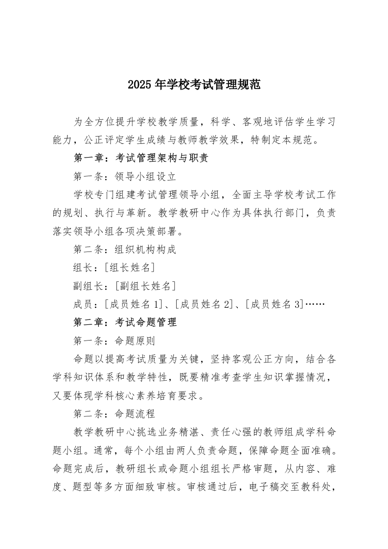 2025年学校考试管理规范为全方位提升学校教学质量,科学、客观地评估学生学习能力,公正评定学生成绩与教师教学效果,特制定本规范。第一章:考试管理架构与职责第一条:领导小组设立学校专门组建考试管理领导小组,全面主导学校考试工作的规划、执行与革新。教学教研中心作为具体执行部门,负责落实领导小组各项决策部署。第二条:组织机构构成组长:[组长姓名]副组长:[副组长姓名]成员:[成员姓名1]、[成员姓名2]、[成员姓名3]…第二章:考试命题管理第一条:命题原则命题以提高考试质量为关键,坚持客观公正方向,结合各学科知识体系和教学特性,既要精准考查学生知识掌握情况,又要体现学科核心素养培育要求。第二条:命题流程教学教研中心挑选业务精湛、责任心强的教师组成学科命题小组。通常,每个小组由两人负责命题,保障命题全面准确。命题完成后,教研组长或命题小组组长严格审题,从内容、难度、题型等多方面细致审核。审核通过后,电子稿交至教科处,