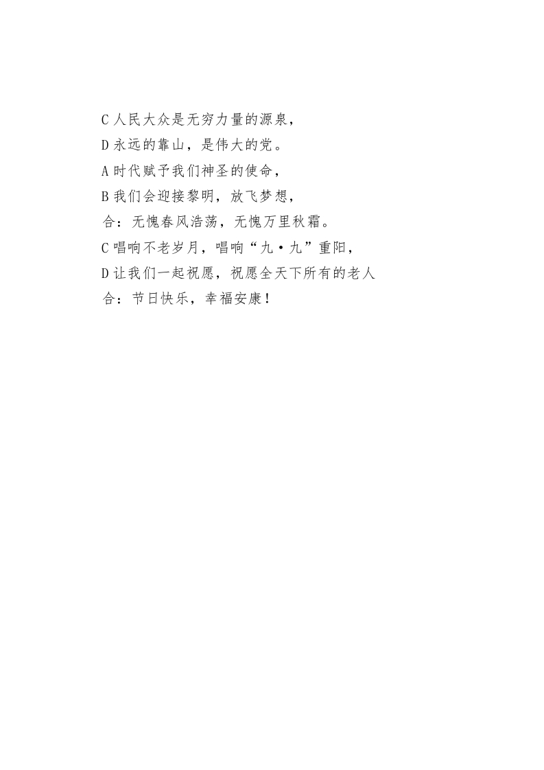 2025年中小学重阳节敬老行活动:岁岁重阳,今又重阳》朗诵稿A穿越千百年的沧桑,迎来又一个“九·九”重阳。B登高远望,层林尽染,候鸟南飞,秋虫低唱。C曾经燃烧的激情再一次把胸腔注满,D昔日飘飞的思绪,乘着灵动的风帆启航。A谁说岁月能催人老去,我们青春的活力正随着歌声飘荡。B谁说晚秋便不再进取,我们每一串脚步都谱写出热烈的诗行。C记忆里盛满浪漫的温馨,我们从中寻觅到早春诱人的花鲜柳绿,盛夏如火的烈日骄阳。D记忆里盛满丰硕的收获,我们从中体味到,秋收沉食的稻谷金浪,迎风飞舞的叶落山香。A怒放的葵花,诉说着早年的梦想。B一颗颗饱满的籽粒,写满敬老的衷肠。C飞天的白鸽略过了当今的渴望,D一道道亮翅的印记绘出不败的夕阳。A尊重、关心、照顾,B所为、所乐、所养,C恰似纽带连接起共同的职责。D互敬互助,漫天晚霞辉煌。AB合:桑榆未晚,更能扶摇直上。