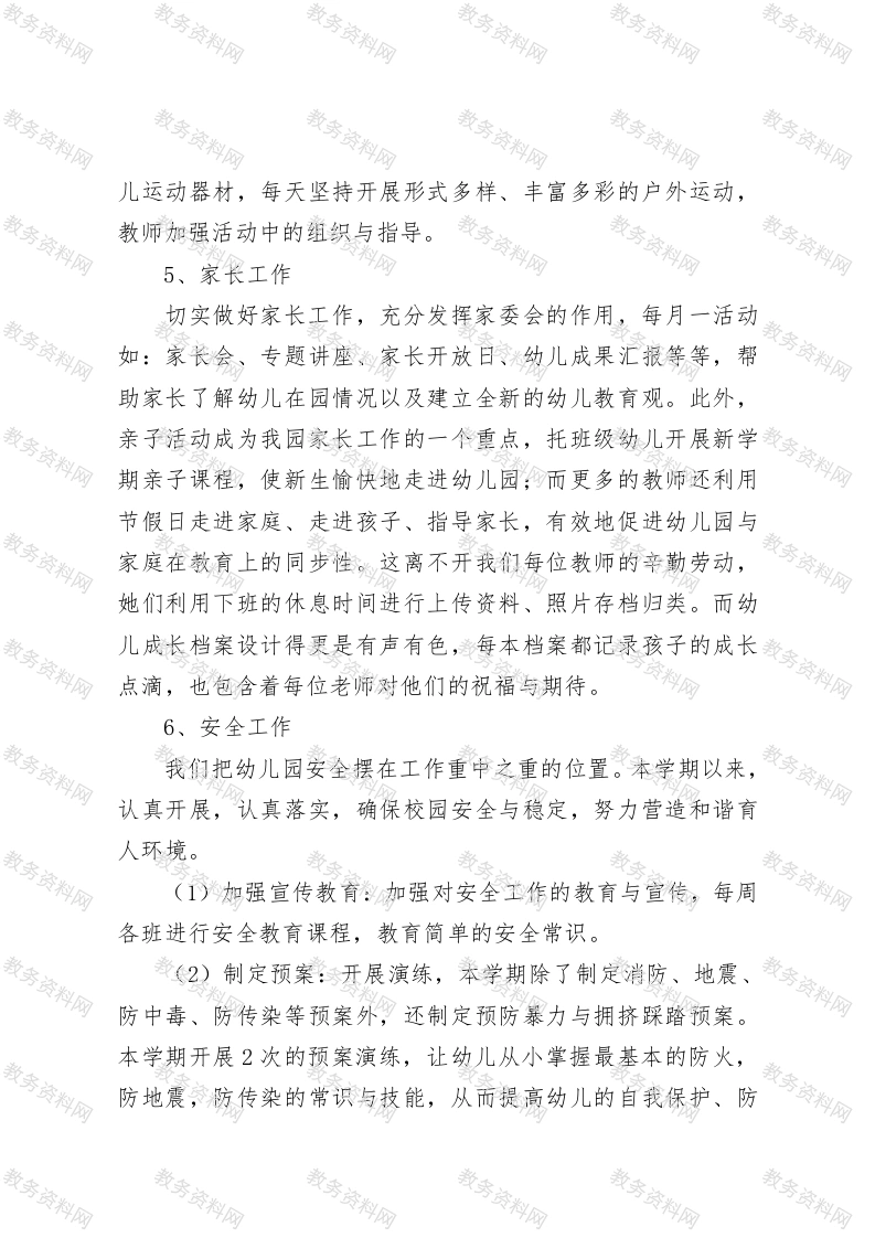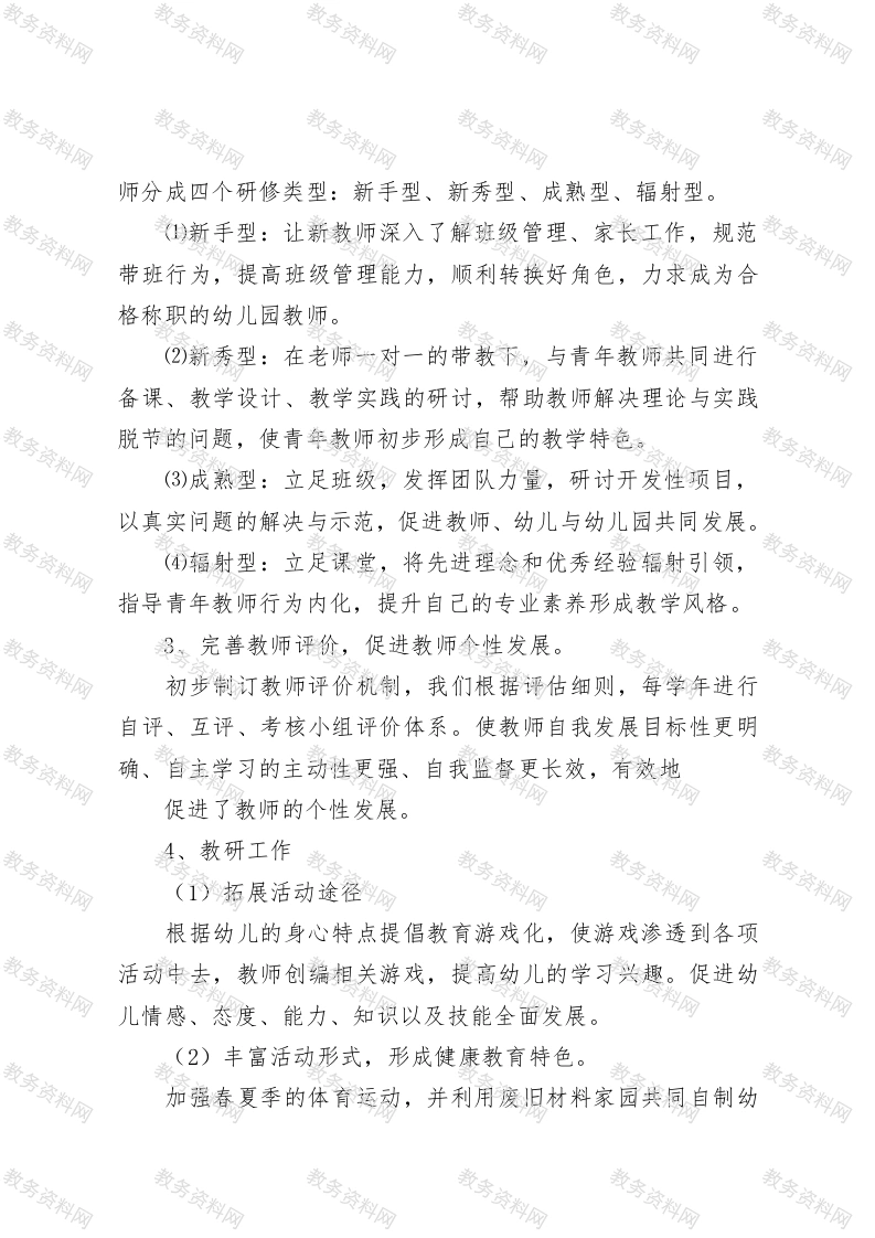 X区X幼儿园2025年保教工作总结本年度我园认真执行《幼儿园指导纲要》精神,坚持贯彻党的教育方针。在局领导及教育局的关心指导下,在全园教职工的共同努力下,努力开展本园双语教育特色。领导班子不断强化内部管理,加强师资队伍建设,开拓进取,使保教质量、服务质量迈上新的台阶,现将幼儿园保教工作总结如下:一、夯实组织基础,激发队伍活力着力推进标准化、规范化建设,充分发挥战斗堡垒作用规范组织生活:严格执行“三会一课”制度,按期召开党建会议,高质量组织开展民主生活会和组织生活会,认真开展批评与自我批评。活动形式多样,包括参观红色教育基地、观看教育影片、社区志愿服务等,增强了组织生活的吸引力和实效性。二、教师队伍建设1、深化师德,树立师表良好形象。学习雷锋月以读书月为平台,弘扬师德。良好的师德师风是教师教育教学工作的前提,我园团委组织全体教师进行了师德读书活动,通过故事的感悟,把从教以来身边的小故事娓娓道来分享,饱含了对幼儿深深的爱与责任,通过座谈形式的沟通与交流,明白了“爱”的重要性。2、多层研修,构建教师发展平台。为了构建教师梯队,使幼儿园可持续发展,我们将全园教