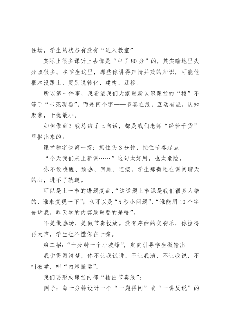 后勤也有“核心竞争力”!校长在经验交流会上这样说:保障质量就是育人基础尊敬的各位老师、各位教育同仁:大家好!今天这场教师大会,说是“例会”,其实我心里并不想照着“流程会议”的路子走。我们不谈什么漂亮话,也不堆模板文件,咱们今天就只聚焦一个核心议题来对话一一教学质量,怎么才能做实,不落空?我知道,这两个字大家耳熟得不能再耳熟,教务处说,教研组也说,哪怕对一个任课老师来说,“提质增效”基本成了下意识反应。但反过来也正是因为说得太多了,我们对这几个字的感知,开始模糊了、疲劳了、漠视了。今天,我不站在一个“任务布置者”的角度讲话,我想和大家做一次“底层共识”的再碰撞。因为我始终坚信:你只有真明白教学质量里头真的是什么,你才有可能带着热度和方向感,走进教室,每天都还能做出微调和更好。一、先把课堂“稳”下来一一因为你若守不住课堂节奏,内容就会塌成“自说自话”作为管理者,我听课听得不少,每一轮巡课下来,我心里也是真的有触动。讲真,一堂课到底质量稳不稳,跟PPT精不精没直接关系,和教案有没有五页也不是一回事。我看的是:老师有没有调得