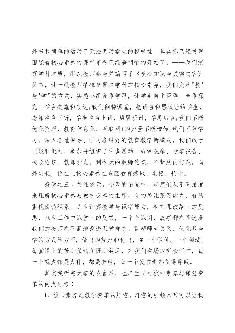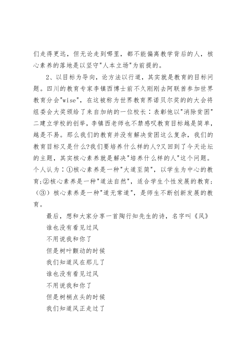 教师论坛后,校长精彩讲话,主要谈了3点感受和2点思考尊敬的局领导、各位校长、各位同事,大家下午好:非常感谢局教研室领导的信任,也非常感谢20位发言人的精彩分享。听完了大家的发言,是真心感到少了大声疾呼的口号,没有空洞无脑的呐喊,有的是真真切切的感受,静下心来的思考和有例有据的论述。听完以后感受有三:感受一:观点新颖。有的老师提出"巧做四则运算,提升语文学科素养",把语文的故事用数学方法来讲,颇有创意;也有老师提出”点素养之灯,照亮信息时代”,还有"落实素养,让学生站在课堂正中央"等观点,这些观点站位前沿、饱含思考、充满智慧,用自己的表达方式体现对核心素养与课堂教学变革的理解。感受之二:论述精彩。老师们的发言中有很多精彩的论述吸引了我。有老师认为"课标是根、教材是本,学生是心”,确实,固好根本,从心出发,方为始终。还有老师提出"教学过程中教师需要学会为学生搭桥、拆桥,甚至过河拆桥”。也有老师提到"课堂革命"与"唤醒"课堂,"唤醒"课堂教学、"唤醒”学生的潜力、"唤醒"学习的热情。我觉得非常好,我们的课堂真的需要被唤醒,在时代飞速发展的今天,老师们,你是否发现仅凭一份教案在讲台上侃侃而谈已无法让学生专注40分钟;仅凭一本练习册、一套试卷已无法保证学生的学习质量;仅凭几本课