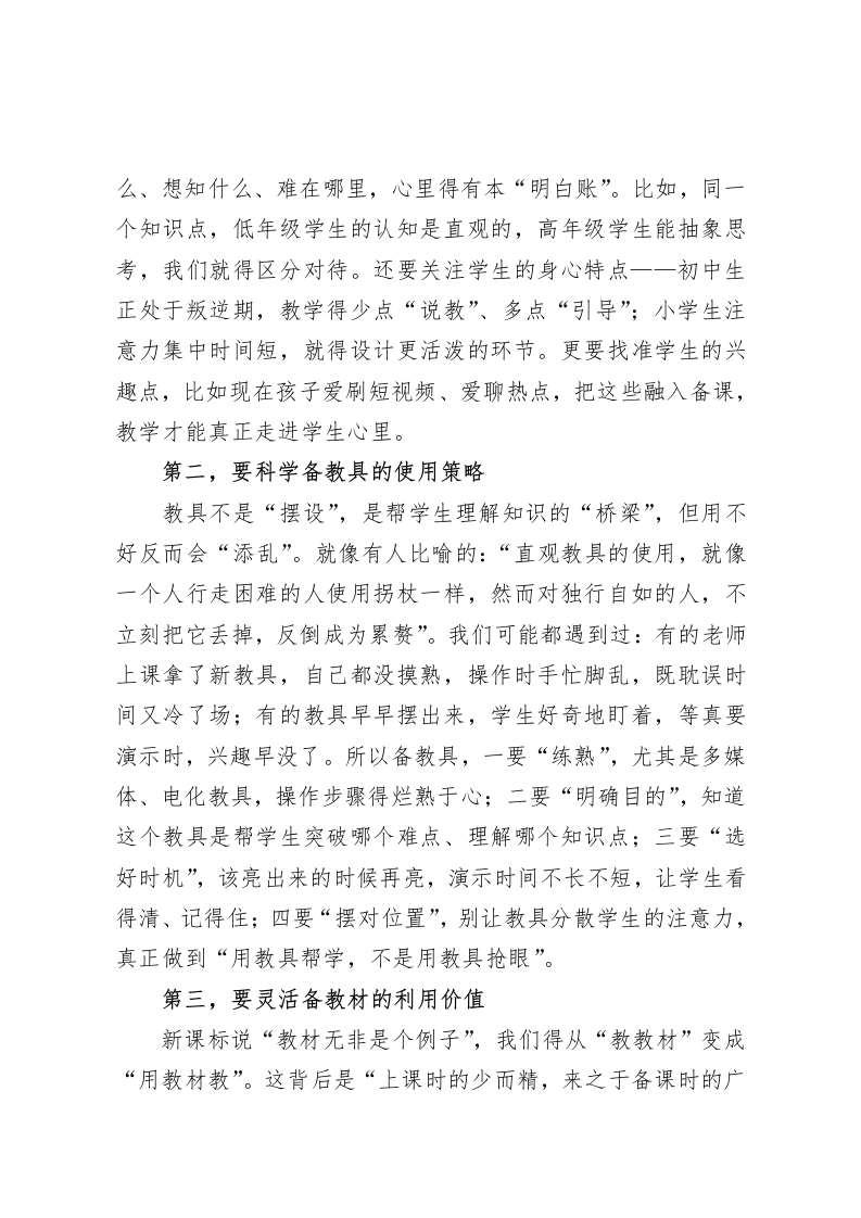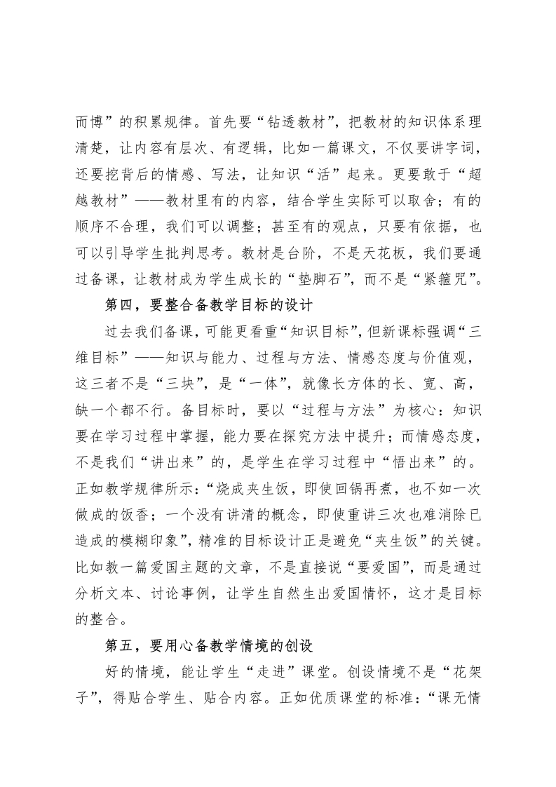 教学副校长在全体教师大会上发言:新课标背景下,我们如何精心备课尊敬的各位老师:大家上午好!今天把大家召集起来,核心是想围绕“新课标背景下如何备课”和大家深入交流。前苏联教育家苏霍姆林斯基曾记录过一位历史教师的名言:“这节课,我准备了一辈子。而且,对于每一节课,我都是用终生的时间来准备的。”后来这句话被概括为“用一生来备好一节课”,这正是备课真谛的生动诠释。我们都是一线教学的实践者,都清楚“备课”是教学的根基一一课堂上的每一次互动、每一个环节,甚至学生脸上的每一个反应,其实都藏在课前的备课里。正如教育界流传的说法:“在备课时多花些时间,如在根上浇水,在课堂上增加学生负担似在叶上施肥”。新课标提出要培养学生的核心素养,强调“自主、合作、探究”的学习方式,这不是对教学的“加码”,而是对我们备课的“提质”要求。如何让备课更精准、更高效、更贴合学生需求?我想从十二个方面,和大家说说我的思考。第一,要精准备学生的心智水平备课先“备人”,这是我们常说的道理,但新课标下更要“精准”。有句话说得好:“将军决胜,在纵观全局,教学成功在知己知彼”。我们得常把“假如我是学生”挂在嘴边:学生已知什