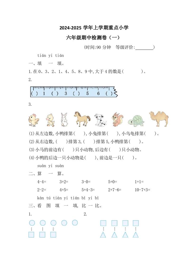 2024-2025学年上学期重点小学六年级期中检测卷(一)(时间:90分钟等级评价:tian yi tian一、填一填。1.在0、3、2、1、4、5、8、9中,大于4的数是()。2.rmnanmmmmmnpmmmmmmmmmm63.(1)从左边数,小鸭排第(),小兔排第(),小乌龟排第()。(2)从右边数,()排第3,()排第5,小鸭排第()。(3)小马的前边有()只小动物,后边有()只小动物。(4)小鸭的后边一只小动物是(),前边是一只()。suan yi suan二、算一算。4-4=3+2=3-0=5+0=1+1=2-2=4+5=5+4-3=2+7-610-7+3=kan tu tian yi tian bi yi bi三、看图填一填,比一比。1.2.O□□