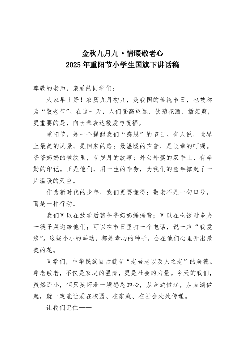 金秋九月九·情暖敬老心2025年重阳节小学生国旗下讲话稿尊敬的老师,亲爱的同学们:大家早上好!农历九月初九,是我国的传统节日,也被称为“敬老节”。在这一天,人们登高望远、饮菊花酒、插茱萸,更重要的是,向长辈表达敬爱与祝福。重阳节,是一个提醒我们“感恩”的节日。有人说,世界上最美的风景,是回家的路;最温暖的声音,是长辈的叮嘱。爷爷奶奶的皱纹里,有岁月的故事:外公外婆的双手上,有辛勤的印记。正是他们,用一生的辛劳,为我们的童年撑起了一片温暖的天空。作为新时代的少年,我们更要懂得:敬老不是一句口号,而是一种行动。我们可以在放学后帮爷爷奶奶捶捶背;可以在吃饭时多夹一筷子菜递给他们;可以在节日里打一个电话,说一声“我爱您”。这些小小的举动,都是孝心的种子,会在他们心里开出最美的花。同学们,中华民族自古就有“老吾老以及人之老”的美德。尊老敬老,不仅是家庭的温情,更是社会的力量。今天的我们,虽然还小,但只要怀着一颗感恩的心,从身边做起,从点滴做起,就一定能让爱在校园、在家庭、在社会处处传递。让我们记住一一
