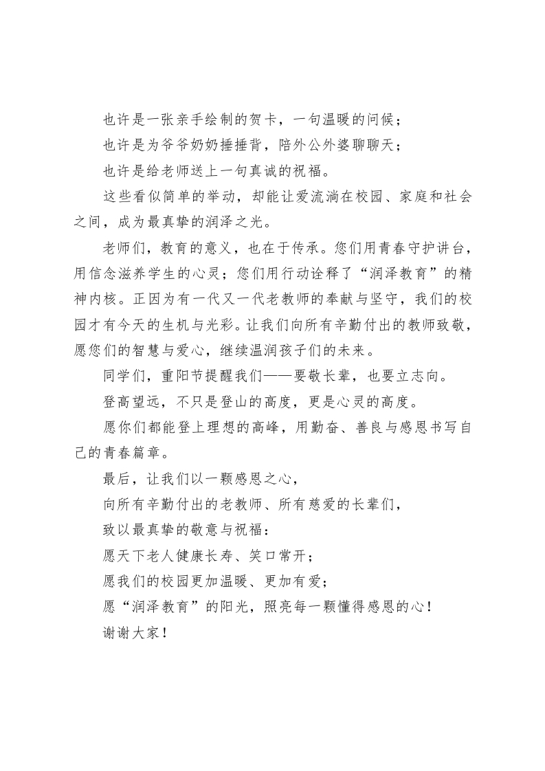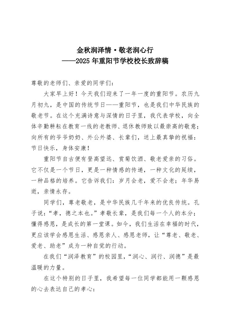 金秋润泽情·敬老润心行2025年重阳节学校校长致辞稿尊敬的老师们、亲爱的同学们:大家早上好!今天我们迎来了一年一度的重阳节。农历九月初九,是中国的传统节日一一重阳节,也是我们中华民族的敬老节。在这个充满诗意与深情的日子里,我代表学校,向全体辛勤耕耘在教育一线的老教师、退休教师致以最崇高的敬意;向所有的爷爷奶奶、外公外婆、长辈们,送上最真挚的祝福:节日快乐,身体安康!重阳节自古便有登高望远、赏菊饮酒、敬老爱亲的习俗。它不仅是一个节日,更是一种情感的传递,一种文化的延续,一种品格的培养。它告诉我们:岁月会老,爱不会老;年华易逝,亲情永存。同学们,尊老敬老,是中华民族几千年来的优良传统。孔子说:“孝,德之本也。”孝敬长辈,是我们每一个人的本分:懂得感恩,是成长的第一堂课。如今,我们生活在幸福的时代,更应该学会感恩生活、感恩亲人、感恩老师,让“尊老、敬老、爱老、助老”成为一种自觉的行动。在我们“润泽教育”的校园里,“润心、润行、润德”是最温暖的力量。在这个特别的日子里,我希望每一位同学都能用一颗感恩的心去表达自己的孝心:
