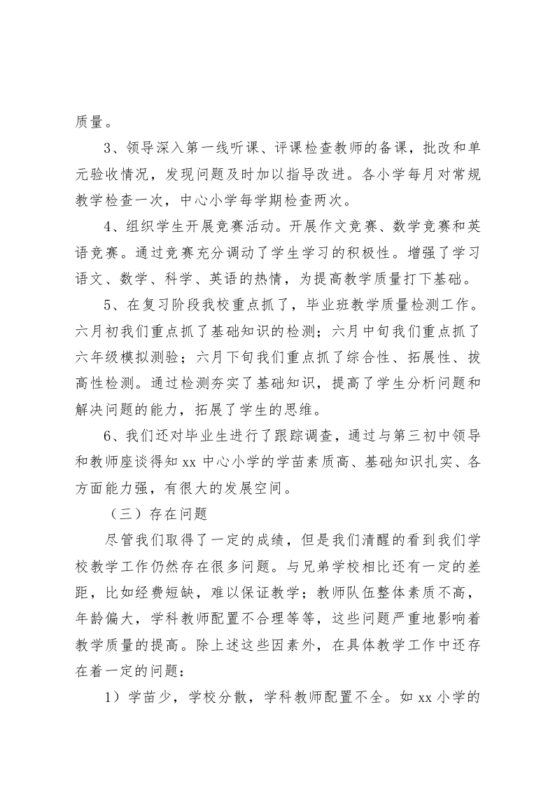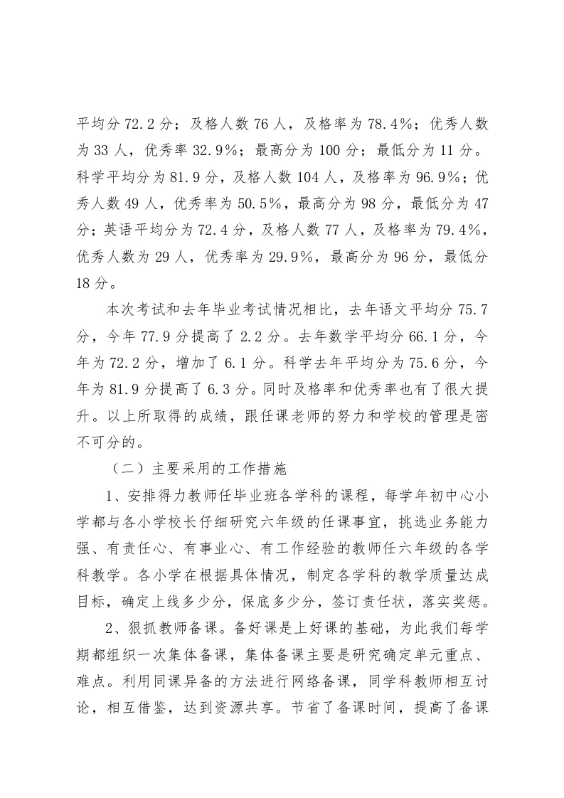 六年级教学质量分析汇报,副校长发言教学质量是一所学校永恒的话题,是学校生存和发展的基础各位教师:为了深入了解和全面掌握,我校六年级教学质量现状,发现教学中存在的问题,为今后毕业班教学工作提供科学依据,并对此提供相应的整改措施,特此对上学期我校六年级学生的毕业考试成绩进行认真的分析。具体分析如下:目前的现状自新课程改革以来,在教育局的领导下,进修学校的指导下,经过x校长和全体任课教师的共同努力,我我校的教学管理工作已逐渐走入规范化的轨道。质量意识也逐步深入人心,新的教学理念也逐步形成。教师也逐步适应新的教学方法,部分年轻的一线教师对新的教学方法运用自如。学生在教师的引领下,学习方法也在悄然的发生着变化,课堂的教学效果也逐渐得到提升。随着县教育局的教育质量年和教育质量提升年工程的实施,我校的教学质量逐年提高,教学管理科学、规范。(一)本次毕业考试成绩统计情况我校上学年共有5个毕业班,108个毕业生,除参加教育局质量检测的11名学生外全部参加考试。本次考试我们采取了换人监考、换人批卷并对考试成绩进行了认真统计。语文平均分77.9分;及格人数为94人,及格率96.9%;优秀人数26人,优秀率为26.8%;最高分为90.5分;最低分为42.5分:数学