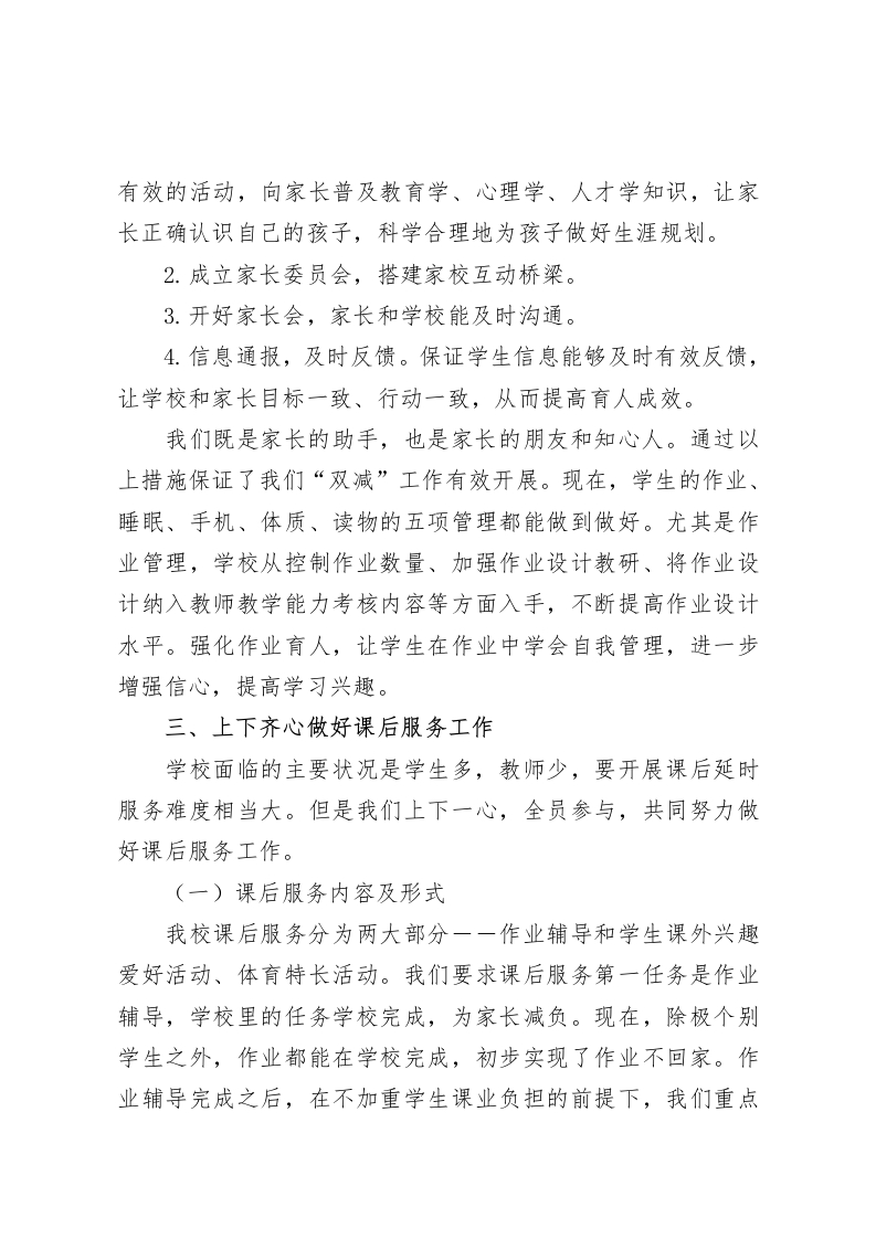 落实双减五项管理课后服务工作汇报“双减”、“五项管理”是国家出台的惠民好政策,开展中小学生课后服务工作,是落实“双减”工作的重要抓手,是促进学生健康成长、解决家长实际问题的民生工程。根据上级的安排部署,学校积极落实“双减”政策,全力推进学生校内课后服务工作,现在我们落实“双减”推进“五项管理”以及开展课后服务工作的情况做如下汇报:我们的工作可以用做好一个统一、抓住一个重点、把握一个核心来概括。一个统一是统一教师思想,一个重点是做好家校合作,一个核心是全员参与,上下一心。一、统一思想,提高认识能否做好一件事儿,关键在人,关键在想不想做。在推进“双减”工作之初,我们遇到了很大阻力,究其原因就是思想上在作怪。“双减”是一个新生事物,和以前的“应试教育”思路大相反。在刚开始推进“双减”工作的时候,很多老师比较消极、茫然失措,主要表现为三点。1.观望、等待。没有认识到国家实施“双减”的决心和意志,仍在一边看风向,一边等待上级部门的指示。2.被动应付。没有充分认识到实施“双减”的重要性,认为学生课业负担年年减,年年重,本次“双减”可能又是一阵风。