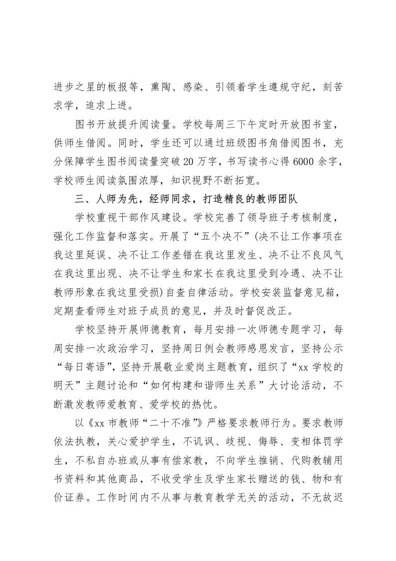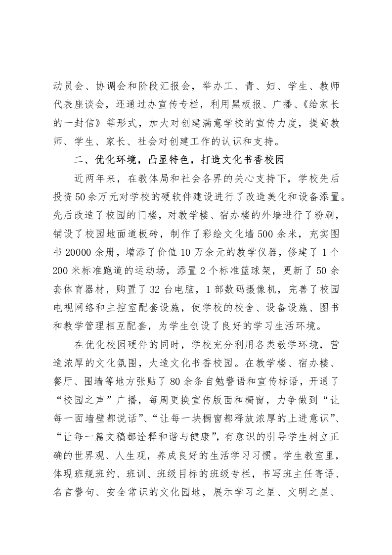 满意学校创建工作,校长汇报用我们的实干精神、拼搏精神去创办人民满意的学校尊敬的教体局领导和各位专家:大家好!首先我代表xx学校全体师生,向今天到会的各位领导和专家,表示热烈的欢迎!对你们在百忙之中莅临我校指导工作表示衷心的感谢!下面,我代表Xx学校校委会,就创建满意学校工作开展情况和取得的成效,向局领导和参加评议的各位专家,作以简要汇报:一、强化组织,广泛宣传,营造浓厚的活动氛围学校高度重视满意学校创建工作,把满意学校创建的过程作为进一步加强校风师风建设、规范教育行为、全面提高教育教学质量的重要措施。为了确保创建工作有序开展,取得预期成效,专门成立了以校长为组长,两位副校长为副组长,各处室主任为成员的“xx学校创建人民满意学校活动领导小组”,领导小组成员分工细致,责任明析,各司其职,具体落实创建工作的方案制定、执行、督查、评估和总结。为了营造上下联动的活动氛围,领导小组从提高思想认识入手,充分利用动员会、座谈会等形式引导教职工增强创建工作责任感和自觉性,以满腔的热情、积极的姿态投入到创人民满意学校活动中来。学校从3月份开始先后五次召开创建工作