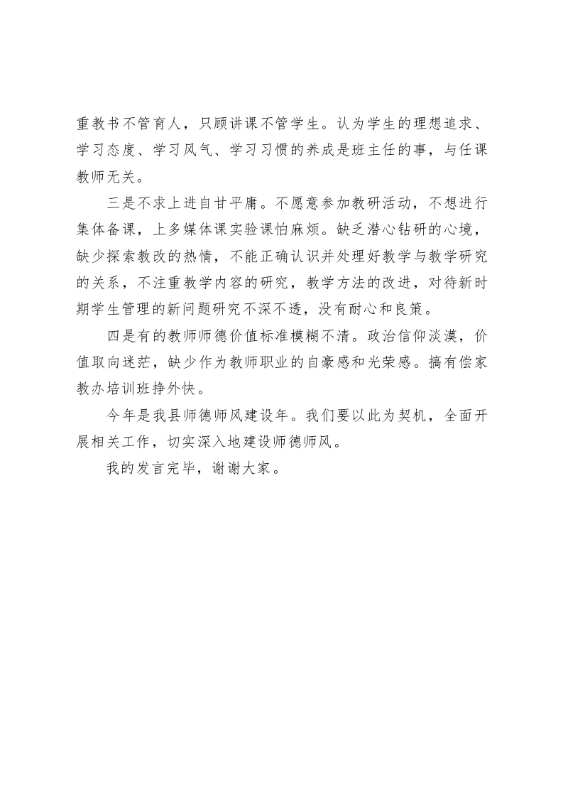 师德师风会,校长简短发言主要讲了4个方面老师们:百年大计,教育为本;教育大计,教师为本;教师大计,重在师德。我们xx学校有着良好的师德师风,爱岗敬业,无私奉献是我们坚定的信念,不甘落后,敢为人先是我们永远的追求,校荣我荣,团结和谐是我们优良的传统。我们有拾金不昧不为金钱所动的Xx老师,有老当益壮年近退休却还坚守教学一线的xx老师,有年富力强活力四射的我校十大杰出青年教师代表Xx老师,有头缠绷带带伤坚守岗位的Xx老师。正是有向他们一样默默奉献埋头苦干的在座的各位,才创造了xx学校骄人的业绩。但是我们必须清醒的认识,我认为有部分教师在职业道德上不尽人意,教师的神圣光环略显暗淡,工程师的灵魂上蒙上了尘埃,使得太阳底下的光辉事业萌生阴影。问题主要表现在以下四个方面:一是有的教师职业责任感比较淡薄。比如有的经常请假,他的事比别人多得多,很忙但忙的不是教学;有的应付偷懒,写工作总结心得体会网上下载原文不动;有的作业批改假批错批,一页一个大对勾;有的考试监场不负责任,对作弊现象坐视不管。二是有的教师教书育人的意识不强,片面认为教师只是传授知识,缺少对教师职业的理解,缺少与学生必要的'沟通,只