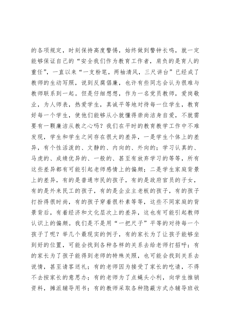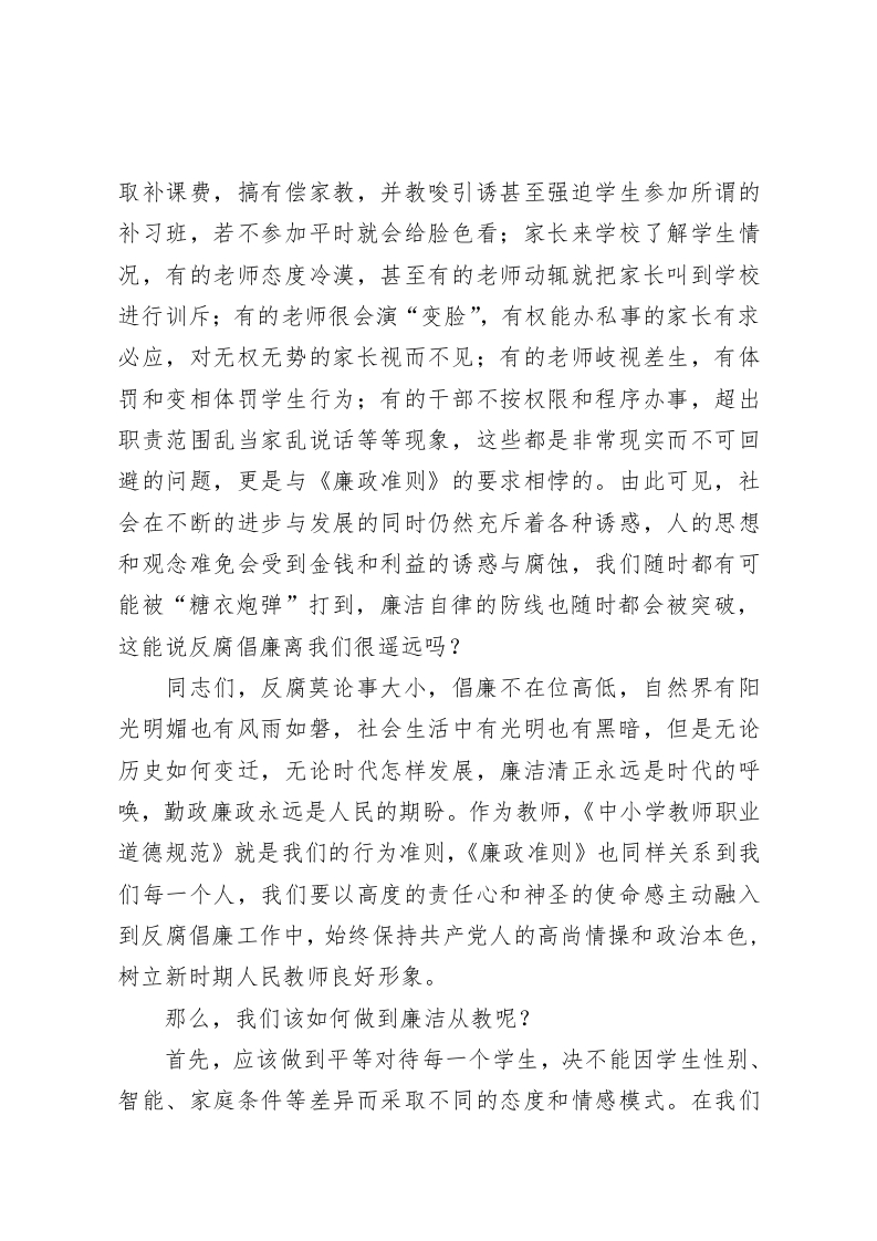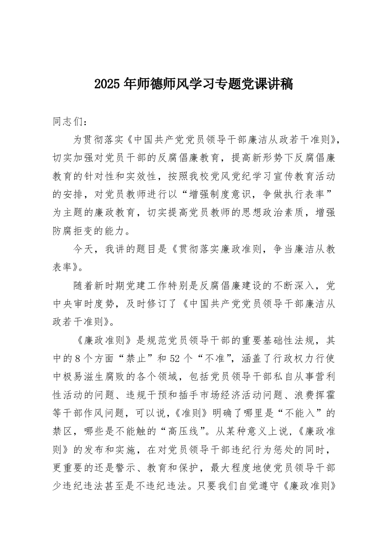 2025年师德师风学习专题党课讲稿同志们:为贯彻落实《中国共产党党员领导干部廉洁从政若干准则》,切实加强对党员干部的反腐倡廉教育,提高新形势下反腐倡廉教育的针对性和实效性,按照我校党风党纪学习宣传教育活动的安排,对党员教师进行以“增强制度意识,争做执行表率”为主题的廉政教育,切实提高党员教师的思想政治素质,增强防腐拒变的能力。今天,我讲的题目是《贯彻落实廉政准则,争当廉洁从教表率》。随着新时期党建工作特别是反腐倡廉建设的不断深入,党中央审时度势,及时修订了《中国共产党党员领导干部廉洁从政若干准则》。《廉政准则》是规范党员领导干部的重要基础性法规,其中的8个方面“禁止”和52个“不准”,涵盖了行政权力行使中极易滋生腐败的各个领域,包括党员领导干部私自从事营利性活动的问题、违规干预和插手市场经济活动问题、浪费挥霍等干部作风问题,可以说,《准则》明确了哪里是“不能入”的禁区,哪些是不能触的“高压线”。从某种意义上说,《廉政准则》的发布和实施,在对党员领导干部违纪行为惩处的同时,更重要的还是警示、教育和保护,最大程度地使党员领导干部少违纪违法甚至是不违纪违法。只要我们自觉遵守《廉政准则》