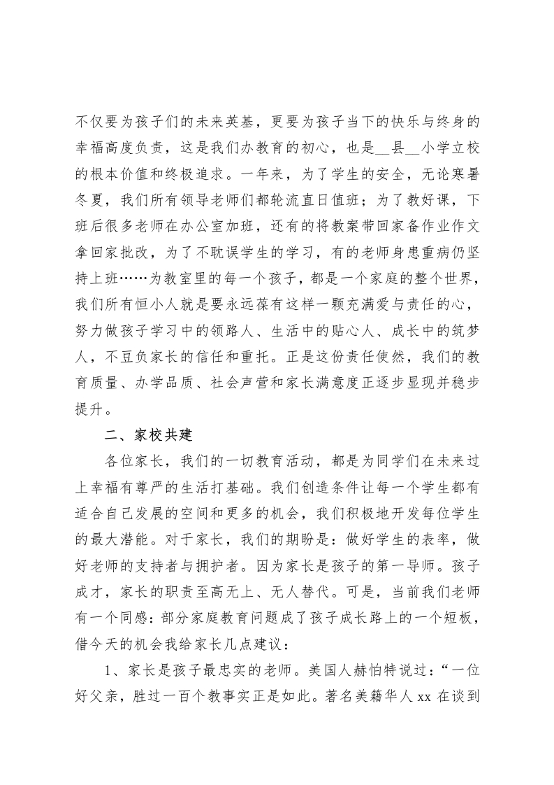 小学校长在家长会上讲话共情力,让我们成为孩子成长的合伙人尊敬的各位家长:大家上午好!今天是周六,感谢大家在百忙之中牺牲宝贵的休息时间前来参加家长会。首先,我代责xx小学全体敢师向各位家长的到来表示热烈的欢迎!向各位家长对学校工作的支持表示夷心的感谢!也借此机会,对学校及班级家委会委员们一年来对我们学校,年级,班级各项工作的关注和帮助毒示责心的感谢!真诚地希望今后你们能一如既往地继续关注支持我们。学校召开这次家长会的目的是为了进一步加强家校之间的联系,共同探讨教育孩子的科学方法,形成家庭教育与学校教育的台力,促进全体学生健康快乐地成长。今天我讲话的题目是《共情力,让我们成为孩子成长的合伙人》,下面我从三个方面与名位家长交流与分享。一、学校现状首先我就学校的基本情况向大家做以简要汇报。学校占地面积30亩,有教学综合楼、食堂宿音楼、设备用房各一栋,200米环形塑胶跑道运动场一个,学校设有校园智能系统控制室、实验仪器室、计算机教室、图书阅览室、美术书法室、创客教室、劳技室、多功能厅、录播教室、红领巾电视台、音乐教室等多个功指部室,总建筑面积xx平米,总投资xx万元,是一