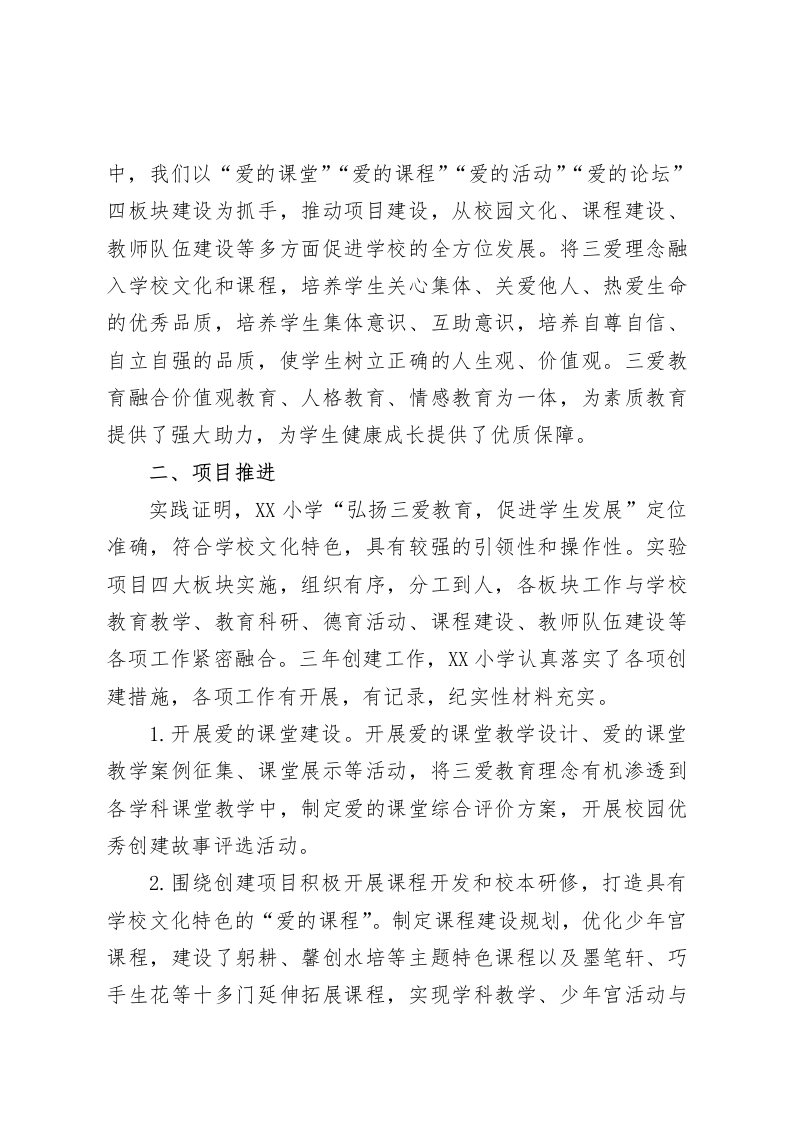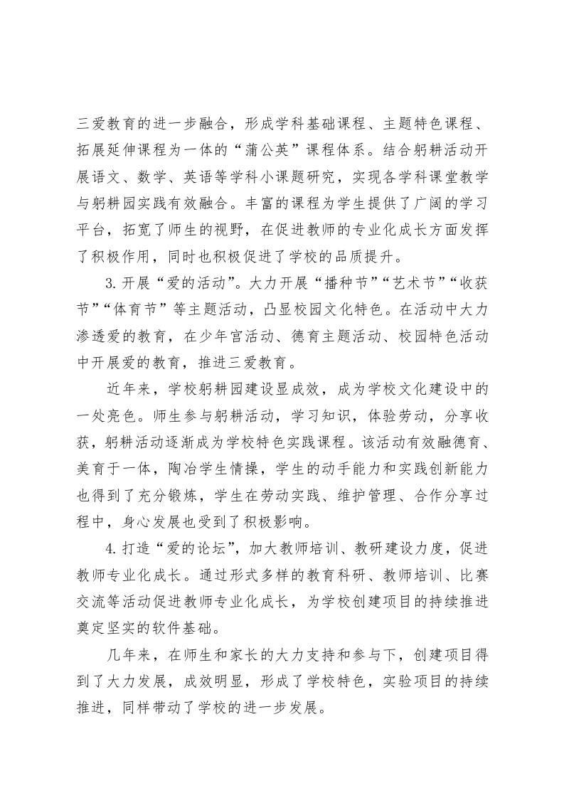 小学新优质学校创建工作汇报发展需要机遇,更需要改革和创新学校发展当立足于实际,在充分审视校情的基础上,寻找一条切合学生成长需要、学校发展现状的办学路线。发展需要机遇,更需要改革和创新。XXXX年,XX小学努力创新思想,规划举措,跻身X市首批新优质学校试点校行列,从此迈向了新时期优质办学之路。以下是XX小学新优质学校创建工作汇报。一、规划实施为规范和落实创建工作,我校积极成立创建工作领导小组,由校长担任组长,各中层部门负责主要工作,全体教师参与创建工作。在学校组织领导下,全体教师进一步学习研讨创建工作,根据学校实际,认真规划各项创建目标,撰写创建工作规划,确定分年度实施计划,规划各项创建措施。建立各项创建工作机制和激励措施。同时及时开展年度自评工作,查摆创建中存在的问题和不足,扎实开展整改工作。在此基础上,我校广泛宣传推广学校创建理念,形成了良好的创建氛围。创建工作开展以来,XX小学针对学校现状,大力加强校园文化建设,坚持“情溢校园,爱满天下”办学理念,提出“爱校”“爱人”“爱己”三爱培养目标,确立了“弘扬三爱教育,促进学生发展”项目。三爱是一种理念。爱校,即热爱校园,关爱集体。爱人,即互相帮助,关爱他人。爱己,即自尊自立,自信自强。创建