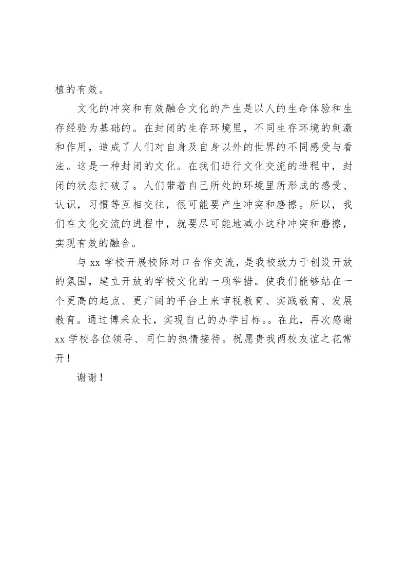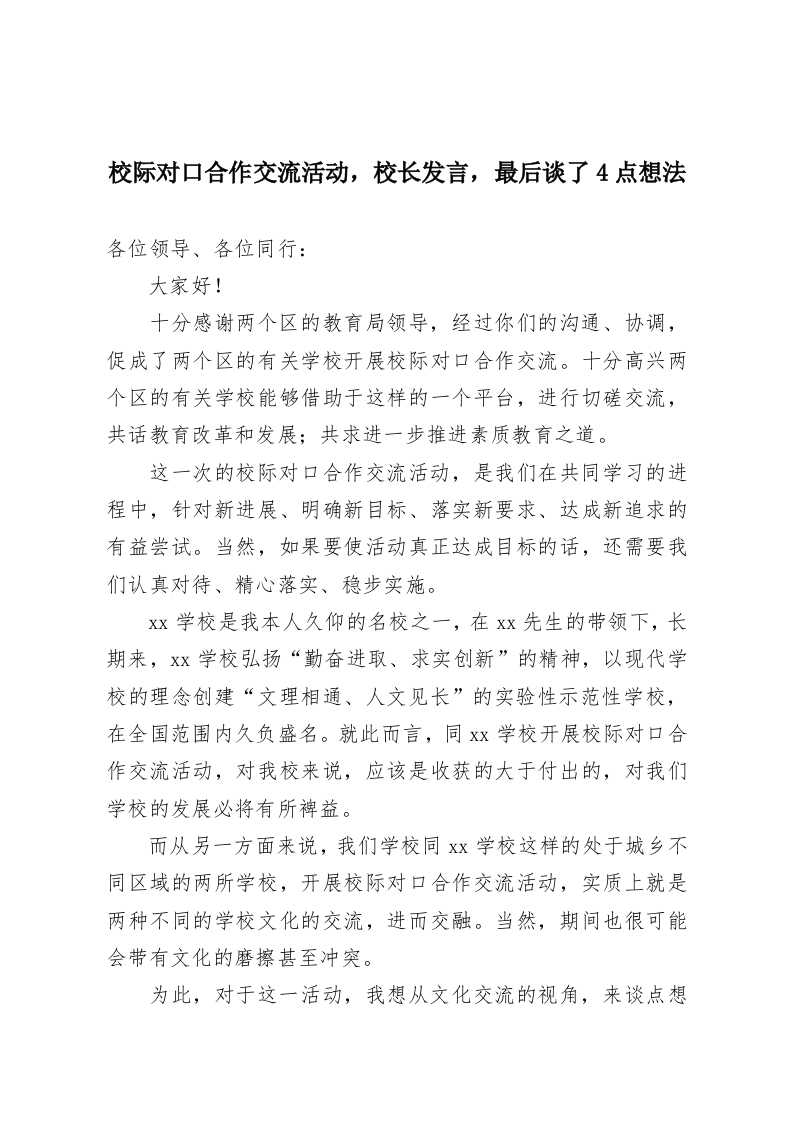 校际对口合作交流活动,校长发言,最后谈了4点想法各位领导、各位同行:大家好!十分感谢两个区的教育局领导,经过你们的沟通、协调,促成了两个区的有关学校开展校际对口合作交流。十分高兴两个区的有关学校能够借助于这样的一个平台,进行切磋交流,共话教育改革和发展:共求进一步推进素质教育之道。这一次的校际对口合作交流活动,是我们在共同学习的进程中,针对新进展、明确新目标、落实新要求、达成新追求的有益尝试。当然,如果要使活动真正达成目标的话,还需要我们认真对待、精心落实、稳步实施。xx学校是我本人久仰的名校之一,在xx先生的带领下,长期来,Xx学校弘扬“勤奋进取、求实创新”的精神,以现代学校的理念创建“文理相通、人文见长”的实验性示范性学校,在全国范围内久负盛名。就此而言,同Xx学校开展校际对口合作交流活动,对我校来说,应该是收获的大于付出的,对我们学校的发展必将有所裨益。而从另一方面来说,我们学校同Xx学校这样的处于城乡不同区域的两所学校,开展校际对口合作交流活动,实质上就是两种不同的学校文化的交流,进而交融。当然,期间也很可能会带有文化的磨擦甚至冲突。为此,对于这一活动,我想从文化交流的视角,来谈点想