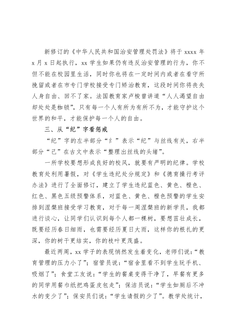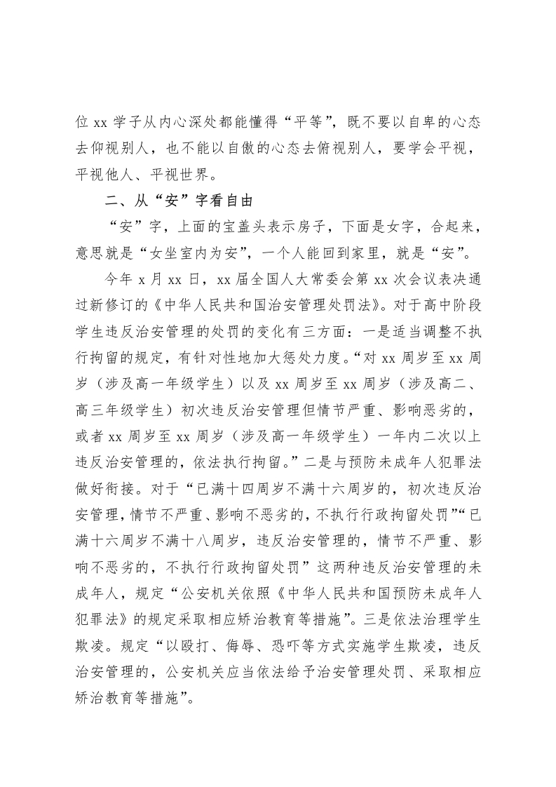 校长在2025年秋法治安全纪律教育大会上的讲话尊敬的各位检察长、庭长、警官、老师们,亲爱的同学们:大家下午好!在县检察院、县法院、县公安局的大力支持下,今天,Xx职教中心成功召开了“良知掌舵启航程法治扬帆护青春”法治安全纪律教育大会。我想与同学们交流“法治”“安全”“纪律”三个词中的“法”“安”“纪”三个字的内涵。一、从“法”字看平等古代的“法”字最早见于西周金文,除了现在的“氵”“去”两部分外,还有“廌”字这部分。“氵”代表“法”要像水面一样平,要公平公正、不偏不倚。“廌”是中国古代传说中的一种神兽,刚正不阿,双目炯炯有神,遇到人与人相互之间发生矛盾,它会用那只角去顶触有错的一方。“去”字旁,有学者认为是去除坏人的意思。中华人民共和国根本大法《中华人民共和国宪法》第xx条写明“中华人民共和国公民在法律面前一律平等”。“法”是刻在每一个中国人血液中的基因,人人平等天经地义,践踏人权必遭严惩。在X月X日新学期第一次升旗时,我已向同学们严正声明,决不允许任何一名xx学生在校内或校外组织或参与以多欺少、以大欺小、以强凌弱,对他人造成人身伤害、财产损失或精神损害的学生欺凌行为,一经发现,立即启动学生违纪处分程序,勒令退学、开除学籍。我希望每一