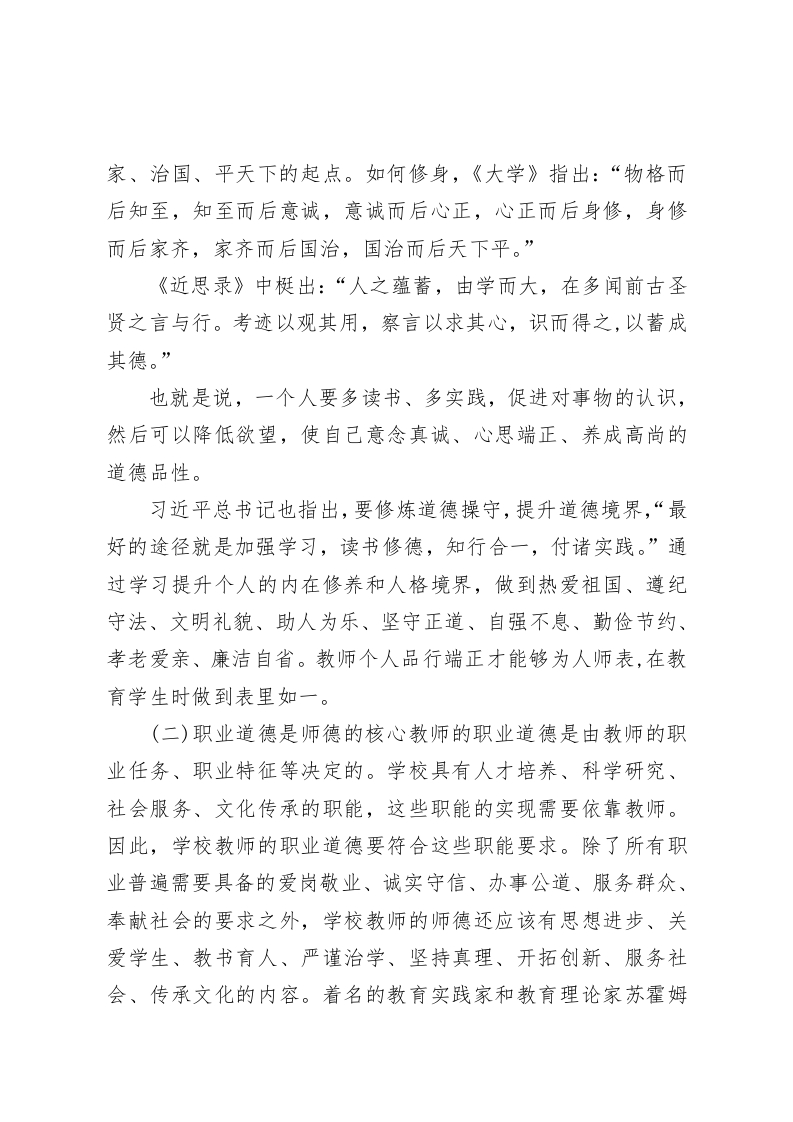 学校师德师风党风廉政教育专题党课立德树人铸师魂,不忘初心正师风各位同事:大家好,今天由我为大家上专题党课,我讲解的题目是:立德树人铸师魂,不忘初心正师风。教育兴旺发达的根本在教师,师德师风建设成为强师兴教的关键。习近平总书记曾经指出:“国无德不兴,人无德不立。”兴国必先强师,强师应以立德为先。从教育大国向教育强国转变过程中,加强师德建设、全面提升教师的综合素质已成为当下强教兴国的重要抓手之一。传承优秀师德文化、加强教师师德师风教育,教师在“立己”中才能更好“立人”所以,我选择这个主题,和大家一起学习交流一下“师德师风”这个课题。我主要从以下三个方面进行讲解:一是师德的内涵,二是当前教师师德师风存在的问题,三是新时代加强师德师风建设的路径。下面,我们进入第一个问题的学习。一、师德的内涵教师是一个古老的职业,自古以来人们在对教师赋予崇高敬意的同时,也对师德提出了特殊的要求。教师职业因其伟大,师德标准也就高于常人。在社会道德存在滑坡的危险、社会风尚急需正确引领的社会转型期,教师的道德修养具有了更广阔的内涵。(一)个人道德修养是师德的基础儒家经典《大学》开篇中就指出:“自天子以至于庶人,壹是皆以修身为本。”修身是齐